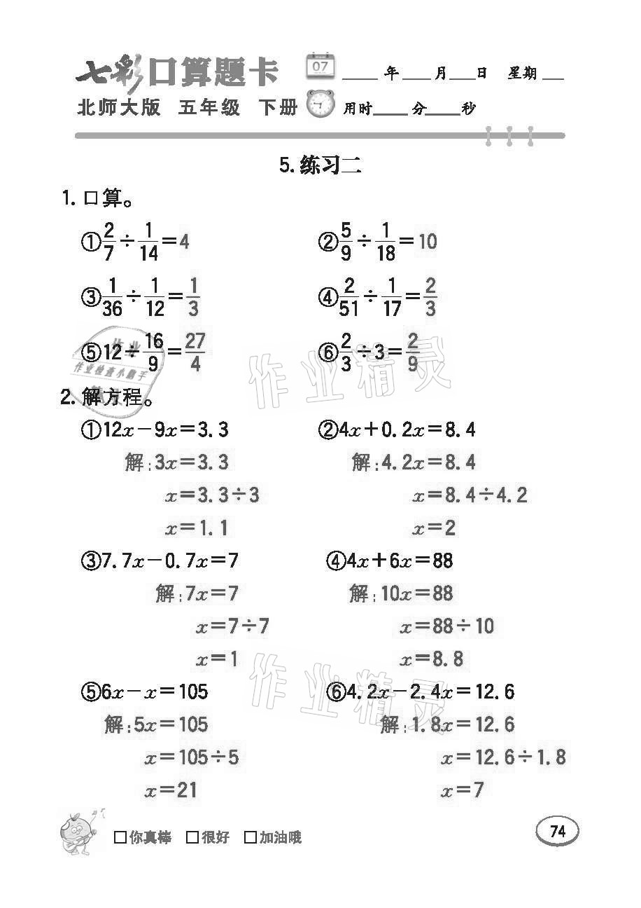 注:目前有些书本章节名称可能整理的还不是很完善,但都是按照顺序排列的,请同学们按照顺序仔细查找。练习册 2021年七彩口算题卡五年级下册北师大版 答案主要是用来给同学们做完题方便对答案用的,请勿直接抄袭。
