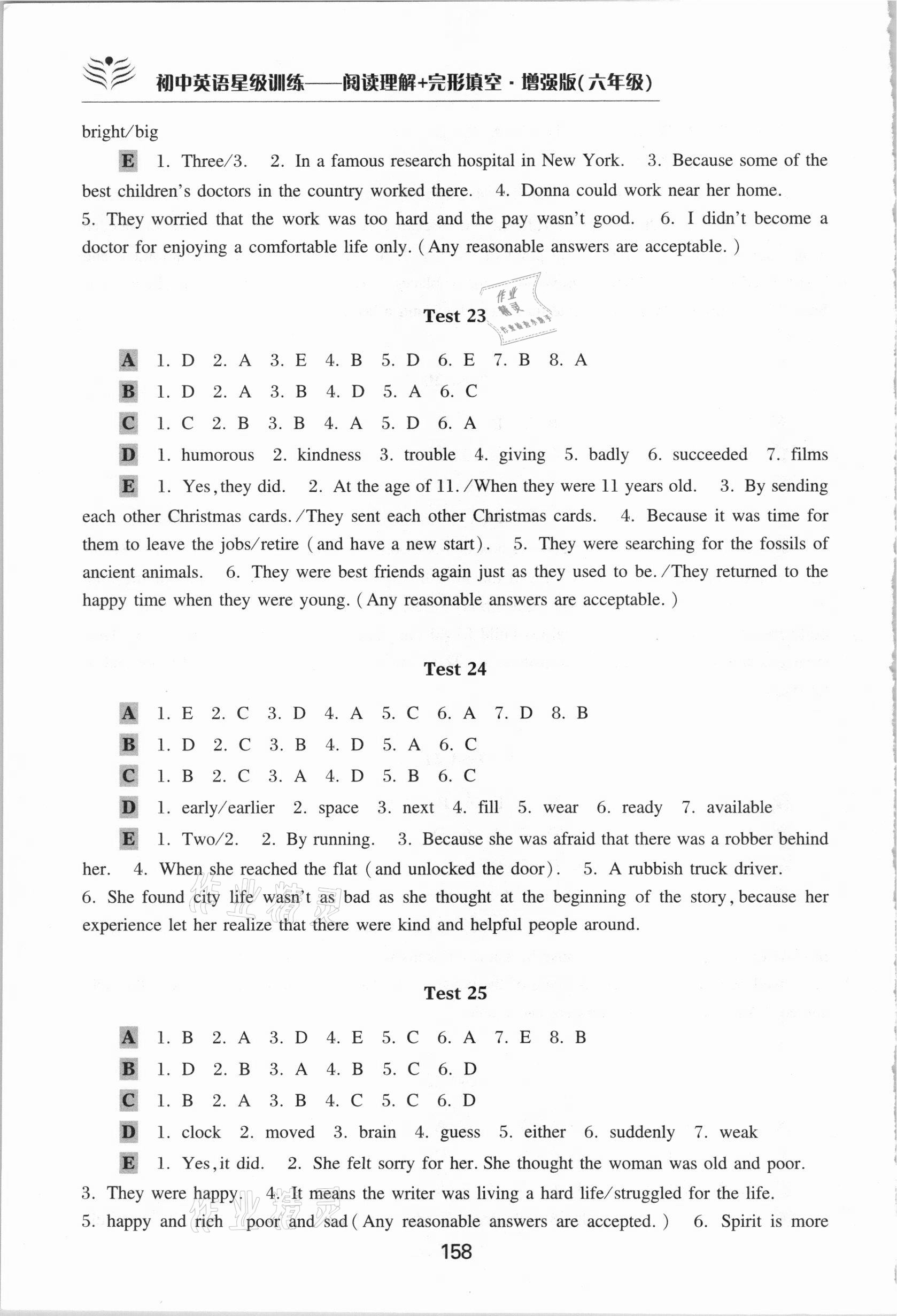 注:目前有些书本章节名称可能整理的还不是很完善,但都是按照顺序排列的,请同学们按照顺序仔细查找。练习册 2021年初中英语星级训练阅读理解加完形填空增强版六年级 答案主要是用来给同学们做完题方便对答案用的,请勿直接抄袭。