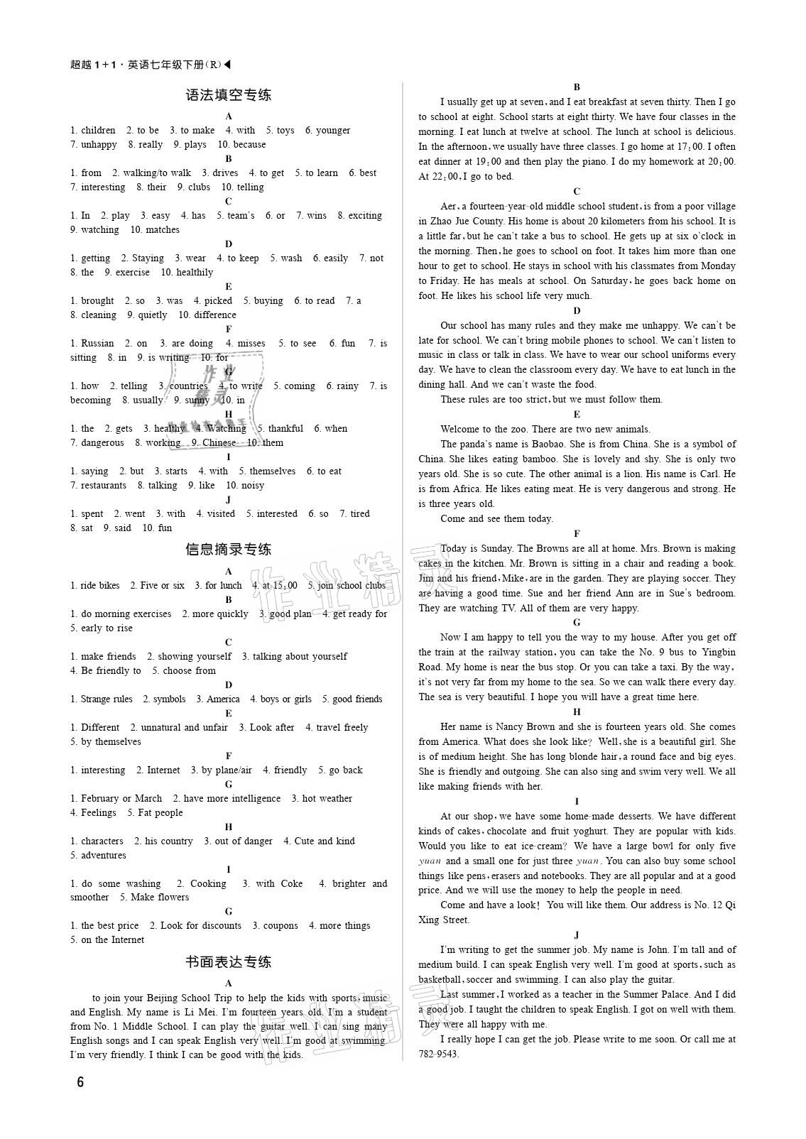 注:目前有些书本章节名称可能整理的还不是很完善,但都是按照顺序排列的,请同学们按照顺序仔细查找。练习册 2021年超越1+1七年级英语下册人教版 答案主要是用来给同学们做完题方便对答案用的,请勿直接抄袭。