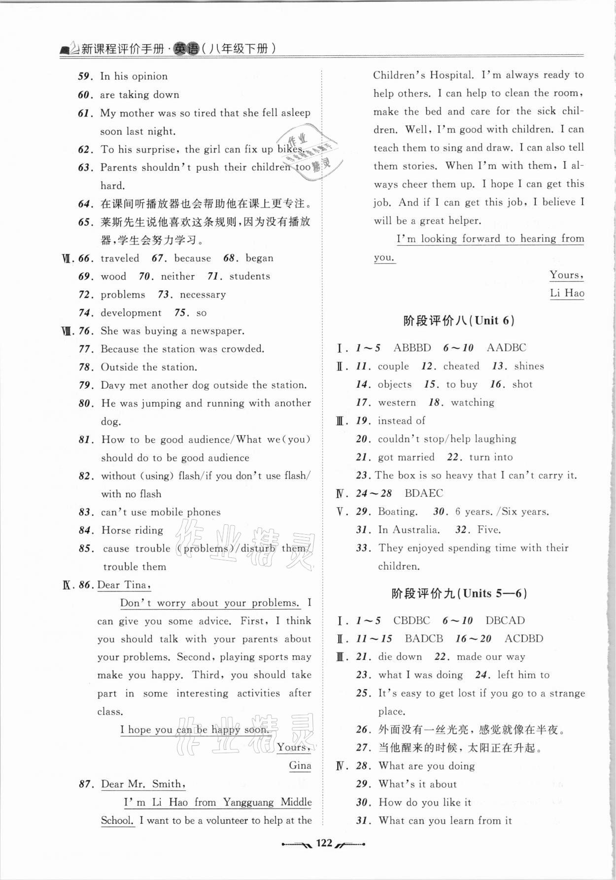 注:目前有些书本章节名称可能整理的还不是很完善,但都是按照顺序排列的,请同学们按照顺序仔细查找。练习册 2021年新课程评价手册八年级英语下册人教版 答案主要是用来给同学们做完题方便对答案用的,请勿直接抄袭。