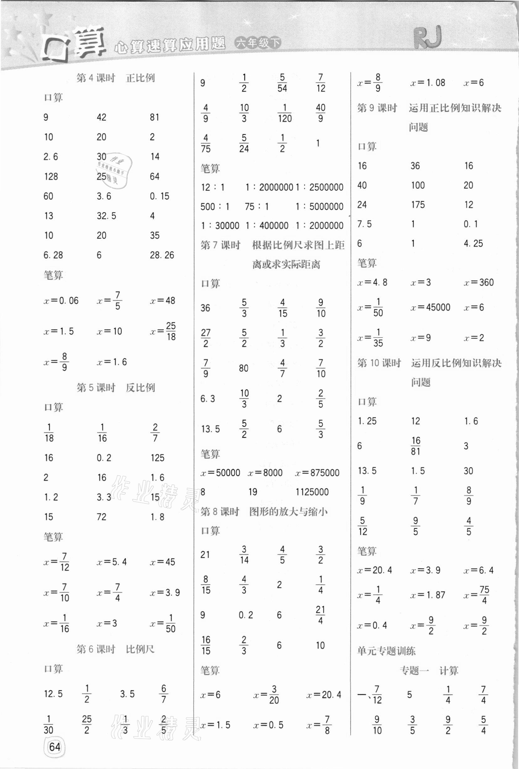 注:目前有些书本章节名称可能整理的还不是很完善,但都是按照顺序排列的,请同学们按照顺序仔细查找。练习册 2021年口算心算速算应用题六年级下册人教版四川大学出版社 答案主要是用来给同学们做完题方便对答案用的,请勿直接抄袭。