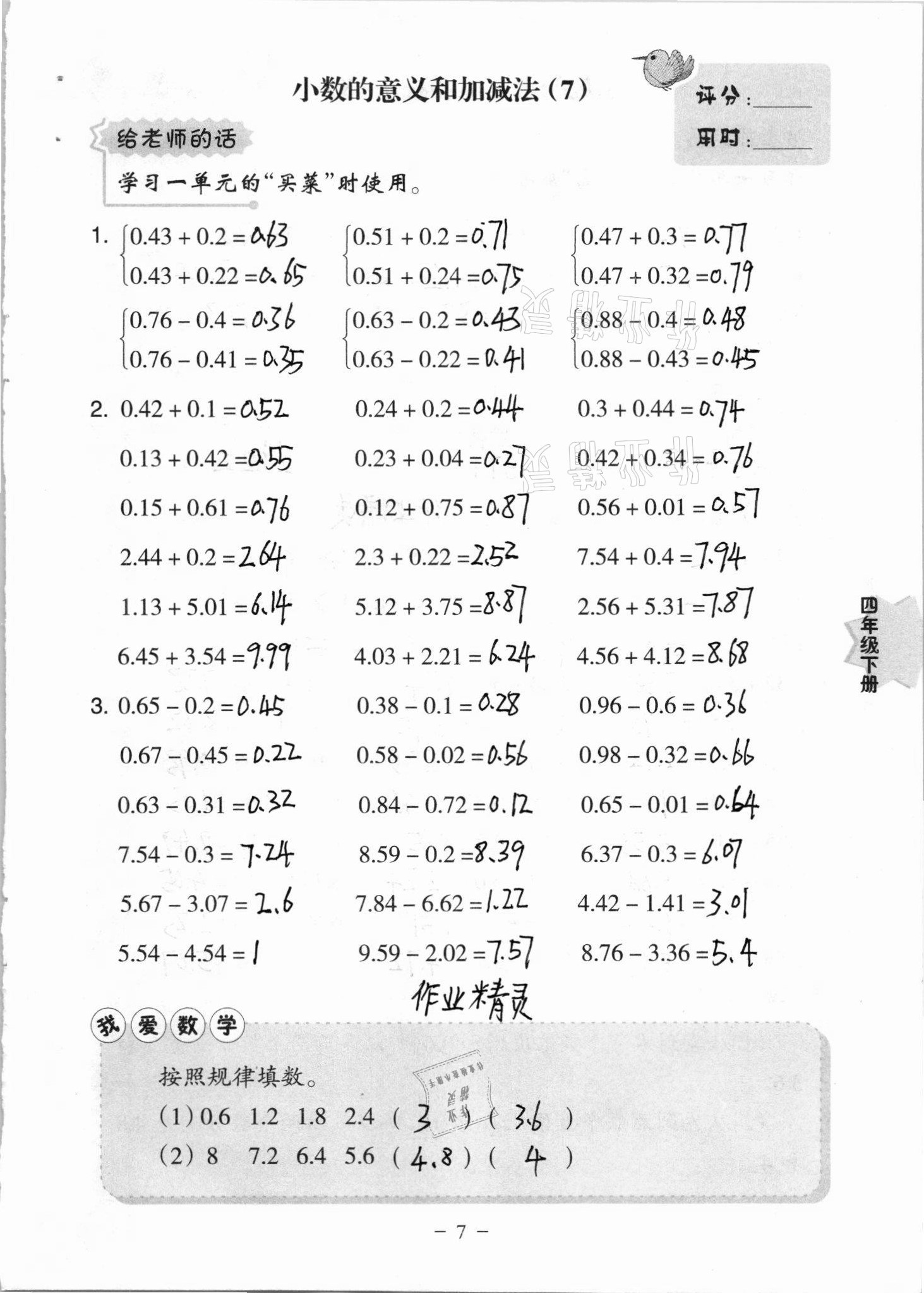 2021年新课标小学数学口算练习册四年级下册北师大版
