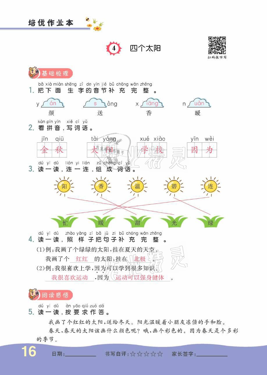 注:目前有些书本章节名称可能整理的还不是很完善,但都是按照顺序排列的,请同学们按照顺序仔细查找。练习册 2021年小学生1课3练培优作业本一年级语文下册人教版 答案主要是用来给同学们做完题方便对答案用的,请勿直接抄袭。