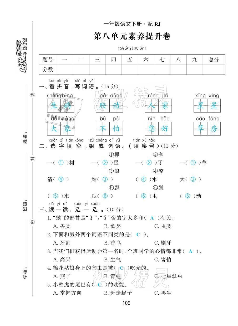 注:目前有些书本章节名称可能整理的还不是很完善,但都是按照顺序排列的,请同学们按照顺序仔细查找。练习册 2021年小学生1课3练培优作业本一年级语文下册人教版 答案主要是用来给同学们做完题方便对答案用的,请勿直接抄袭。