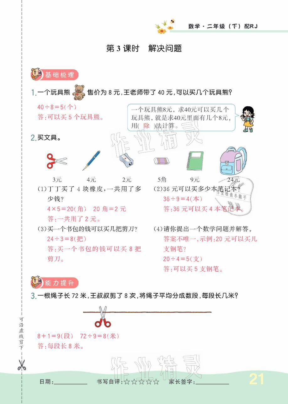 2021年小学生1课3练培优作业本二年级数学下册人教版