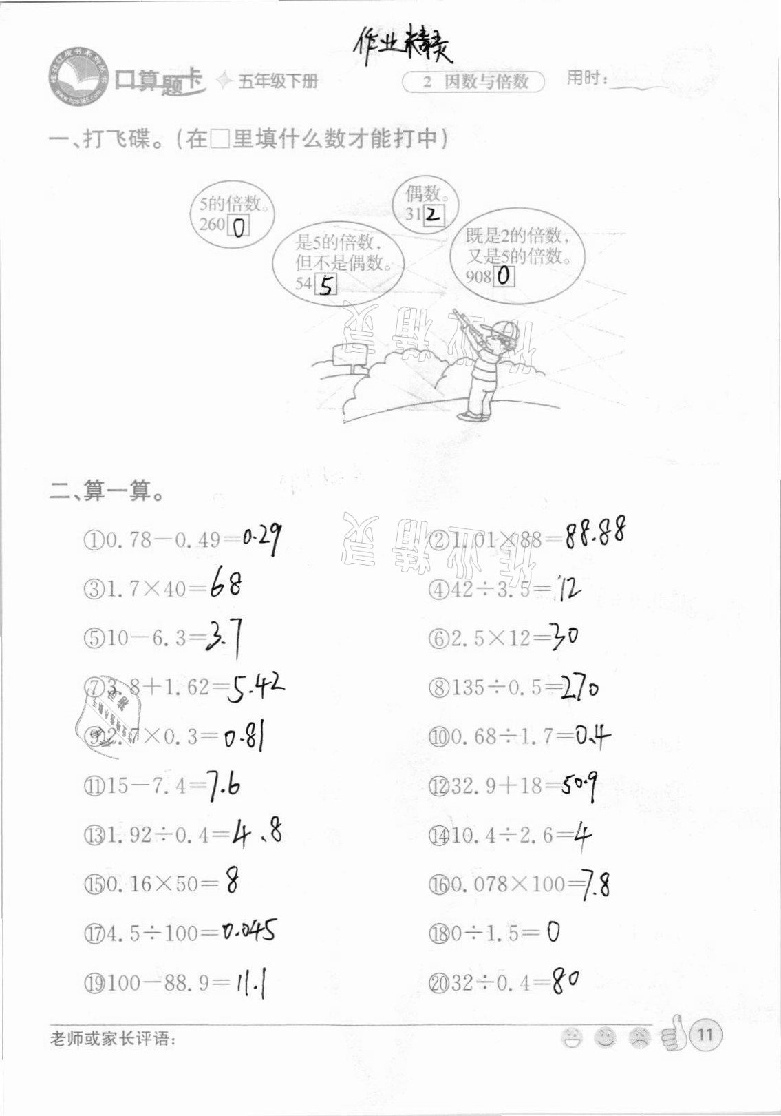 2021年桂壮红皮书口算题卡五年级下册人教版