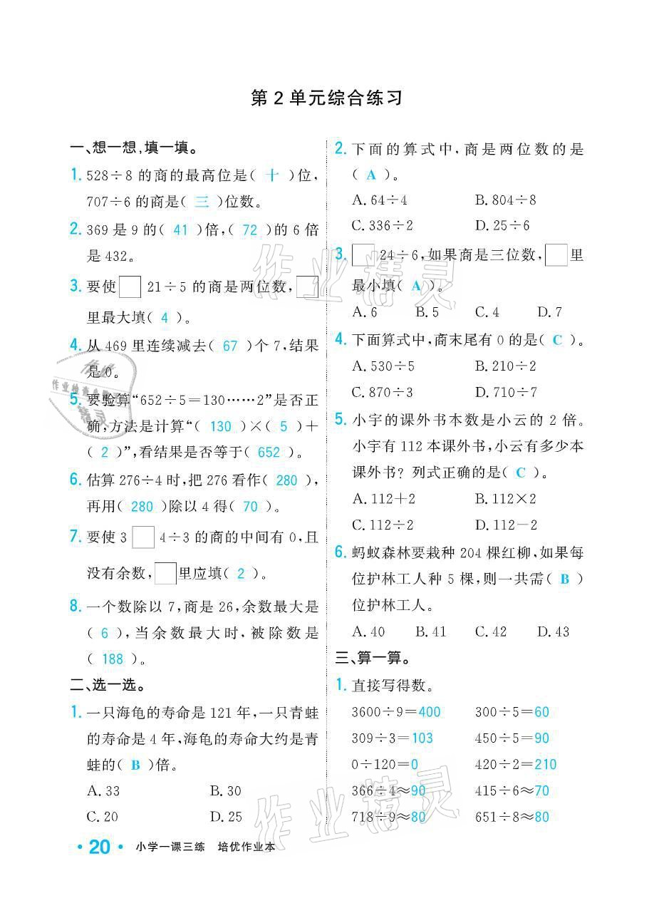 注:目前有些书本章节名称可能整理的还不是很完善,但都是按照顺序排列的,请同学们按照顺序仔细查找。练习册 2021年小学生1课3练培优作业本三年级数学下册人教版 答案主要是用来给同学们做完题方便对答案用的,请勿直接抄袭。