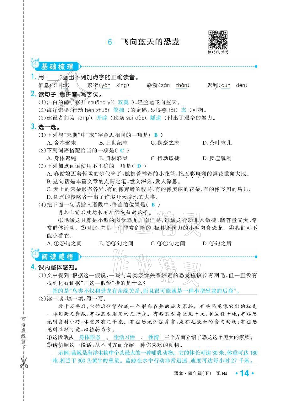 注:目前有些书本章节名称可能整理的还不是很完善,但都是按照顺序排列的,请同学们按照顺序仔细查找。练习册 2021年小学1课3练培优作业本四年级语文下册人教版 答案主要是用来给同学们做完题方便对答案用的,请勿直接抄袭。