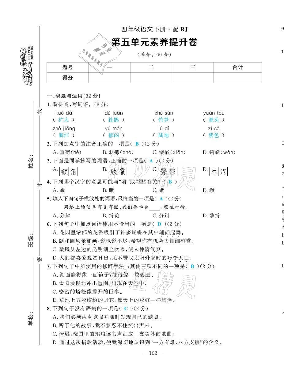 注:目前有些书本章节名称可能整理的还不是很完善,但都是按照顺序排列的,请同学们按照顺序仔细查找。练习册 2021年小学1课3练培优作业本四年级语文下册人教版 答案主要是用来给同学们做完题方便对答案用的,请勿直接抄袭。