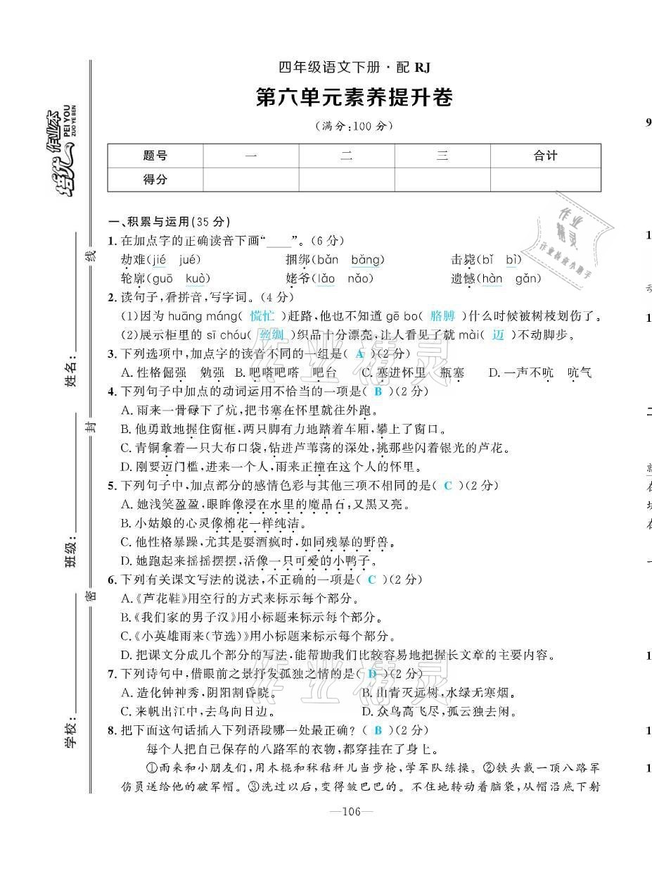 注:目前有些书本章节名称可能整理的还不是很完善,但都是按照顺序排列的,请同学们按照顺序仔细查找。练习册 2021年小学1课3练培优作业本四年级语文下册人教版 答案主要是用来给同学们做完题方便对答案用的,请勿直接抄袭。