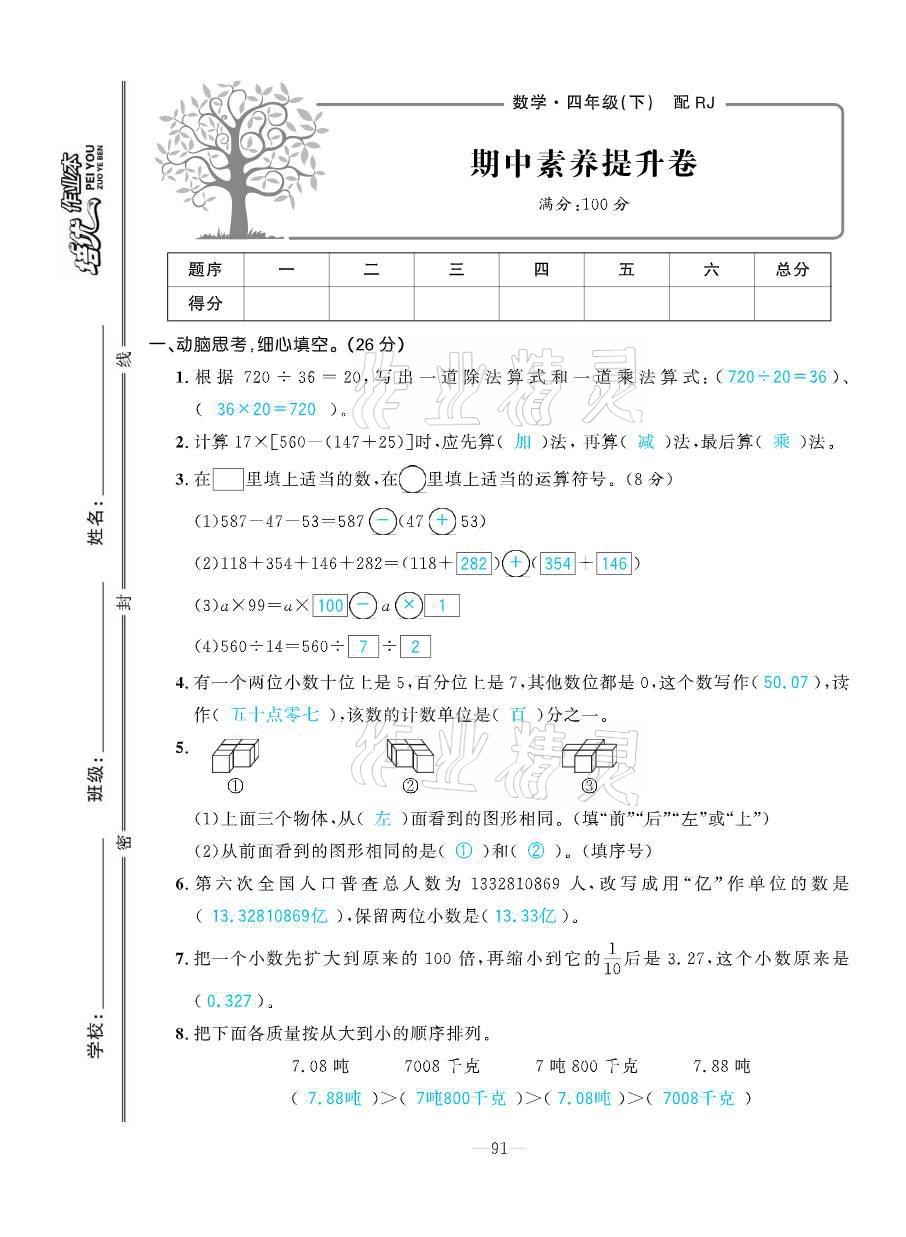 注:目前有些书本章节名称可能整理的还不是很完善,但都是按照顺序排列的,请同学们按照顺序仔细查找。练习册 2021年小学生1课3练培优作业本四年级数学下册人教版 答案主要是用来给同学们做完题方便对答案用的,请勿直接抄袭。