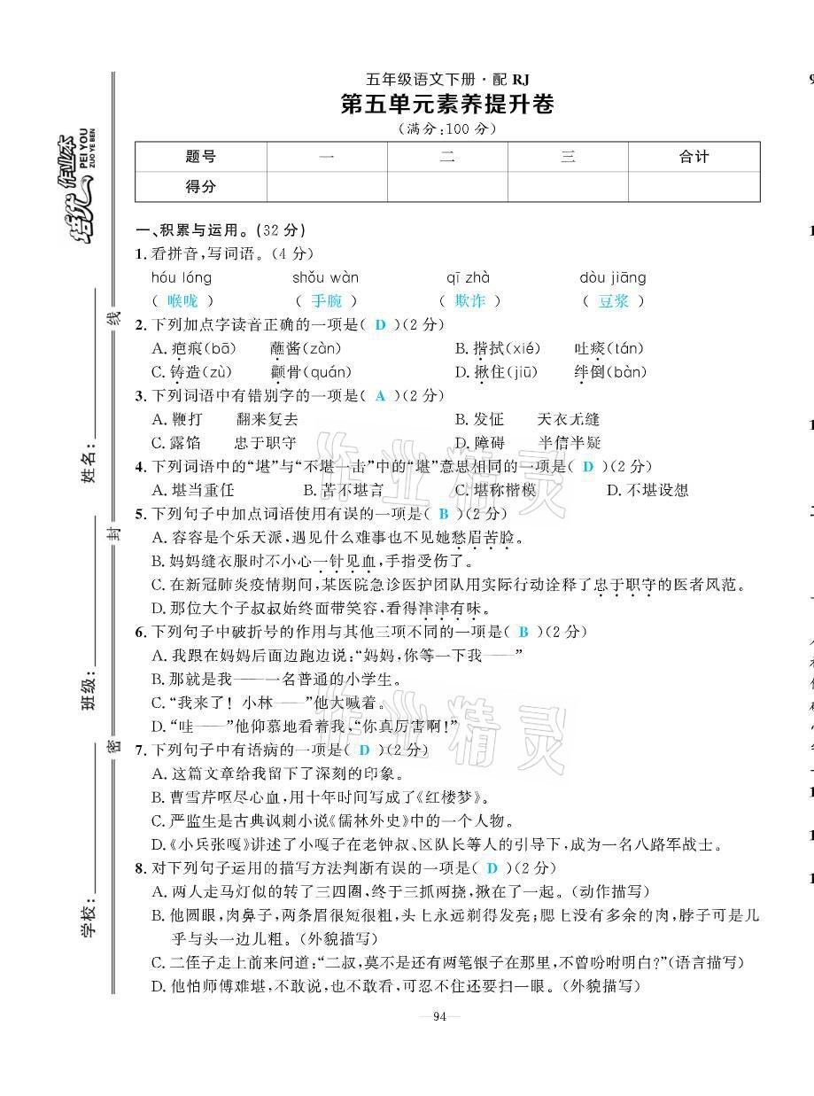 2021年小学生1课3练培优作业本五年级语文下册人教版