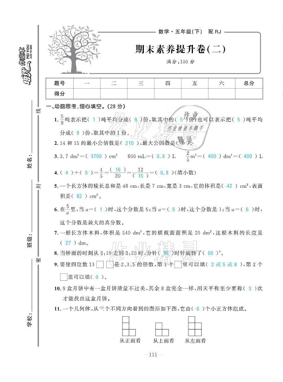 注:目前有些书本章节名称可能整理的还不是很完善,但都是按照顺序排列的,请同学们按照顺序仔细查找。练习册 2021年小学生1课3练培优作业本五年级数学下册人教版 答案主要是用来给同学们做完题方便对答案用的,请勿直接抄袭。