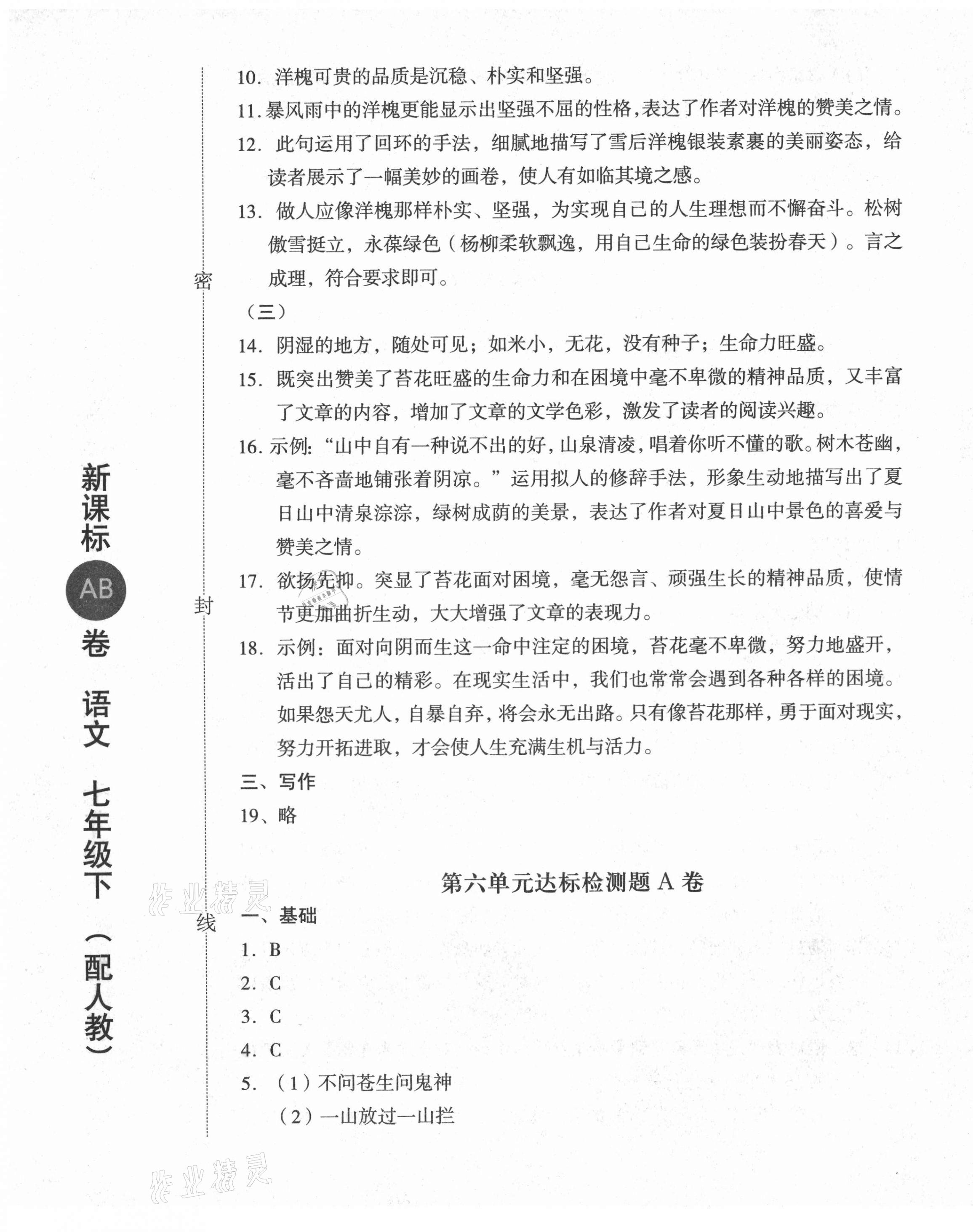 注:目前有些书本章节名称可能整理的还不是很完善,但都是按照顺序排列的,请同学们按照顺序仔细查找。练习册 2021年新课标AB卷单元测试七年级语文下册人教版 答案主要是用来给同学们做完题方便对答案用的,请勿直接抄袭。