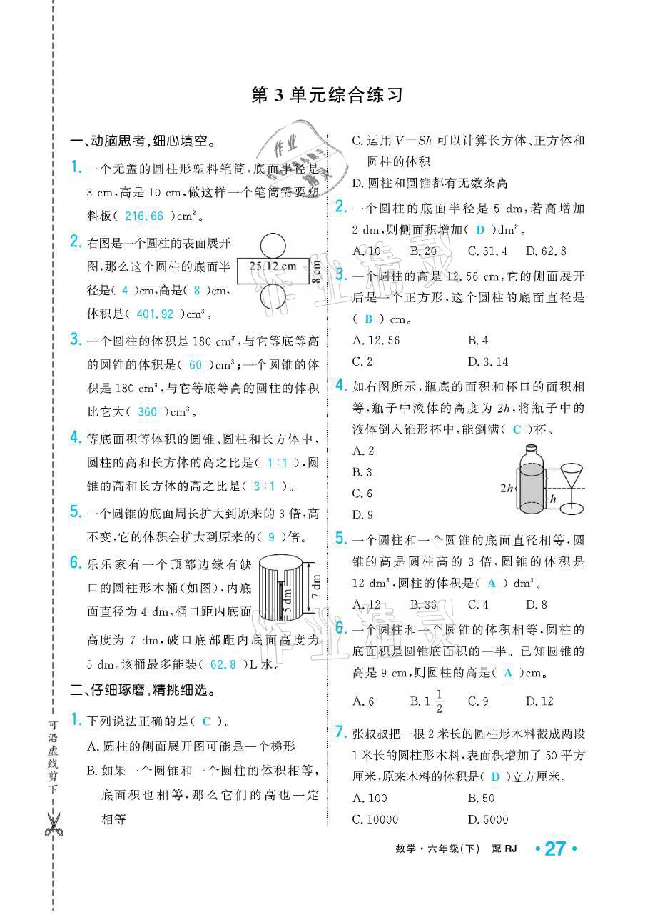 注:目前有些书本章节名称可能整理的还不是很完善,但都是按照顺序排列的,请同学们按照顺序仔细查找。练习册 2021年小学生1课3练培优作业本六年级数学下册人教版 答案主要是用来给同学们做完题方便对答案用的,请勿直接抄袭。