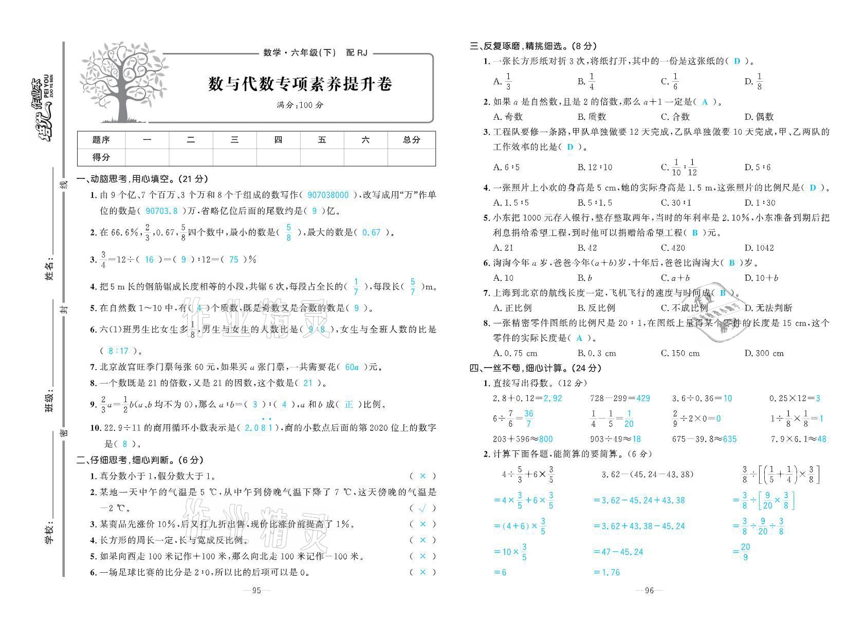 注:目前有些书本章节名称可能整理的还不是很完善,但都是按照顺序排列的,请同学们按照顺序仔细查找。练习册 2021年小学生1课3练培优作业本六年级数学下册人教版 答案主要是用来给同学们做完题方便对答案用的,请勿直接抄袭。