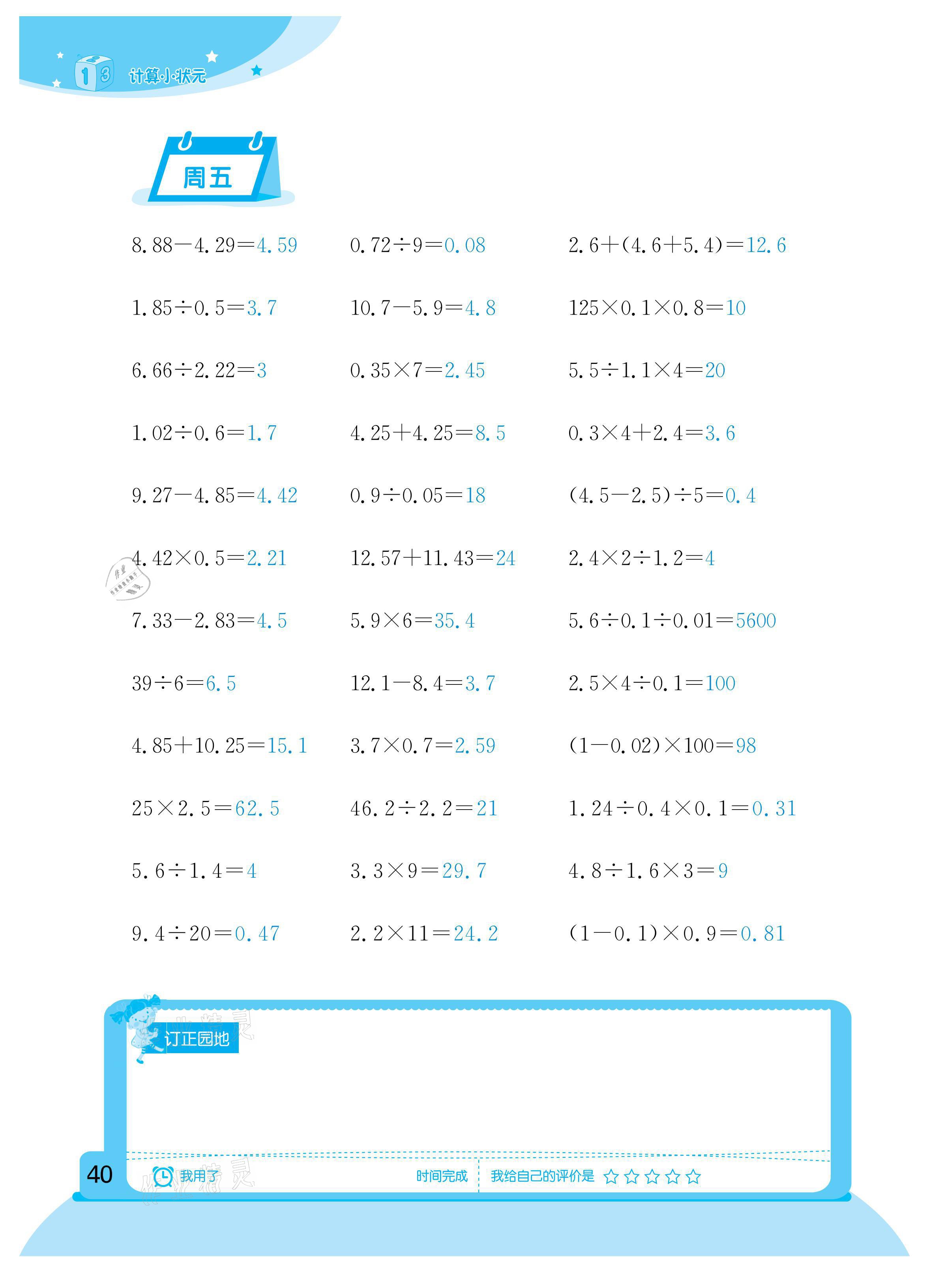 注:目前有些书本章节名称可能整理的还不是很完善,但都是按照顺序排列的,请同学们按照顺序仔细查找。练习册 2021年计算小状元五年级下册新疆文化出版社 答案主要是用来给同学们做完题方便对答案用的,请勿直接抄袭。
