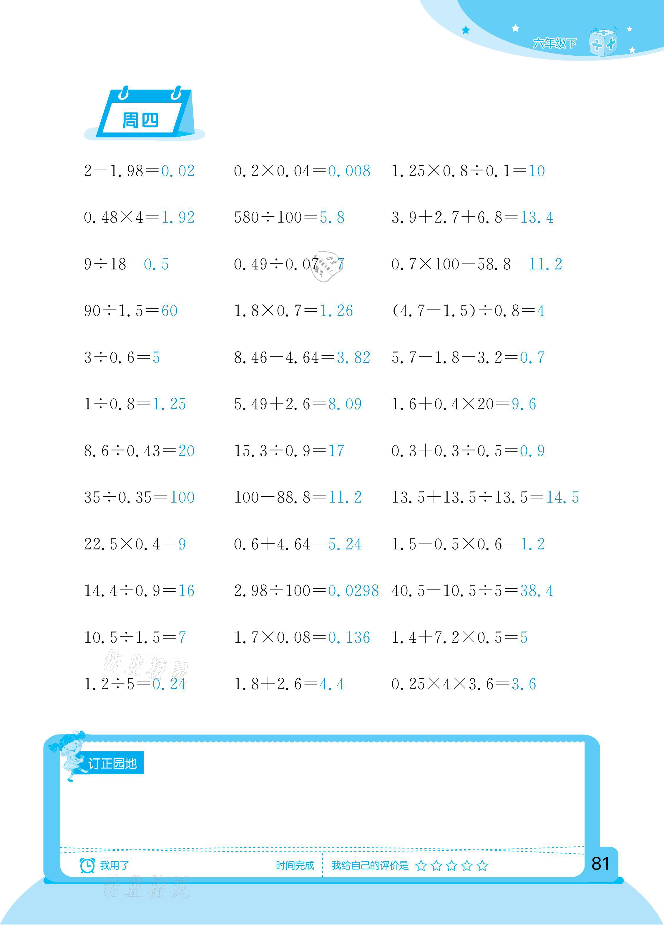 2021年计算小状元六年级下册新疆文化出版社