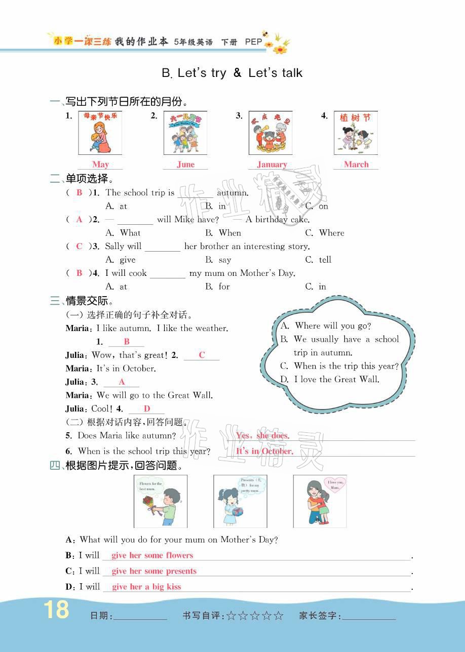 注:目前有些书本章节名称可能整理的还不是很完善,但都是按照顺序排列的,请同学们按照顺序仔细查找。练习册 2021年小学一课三练我的作业本五年级英语下册人教版 答案主要是用来给同学们做完题方便对答案用的,请勿直接抄袭。