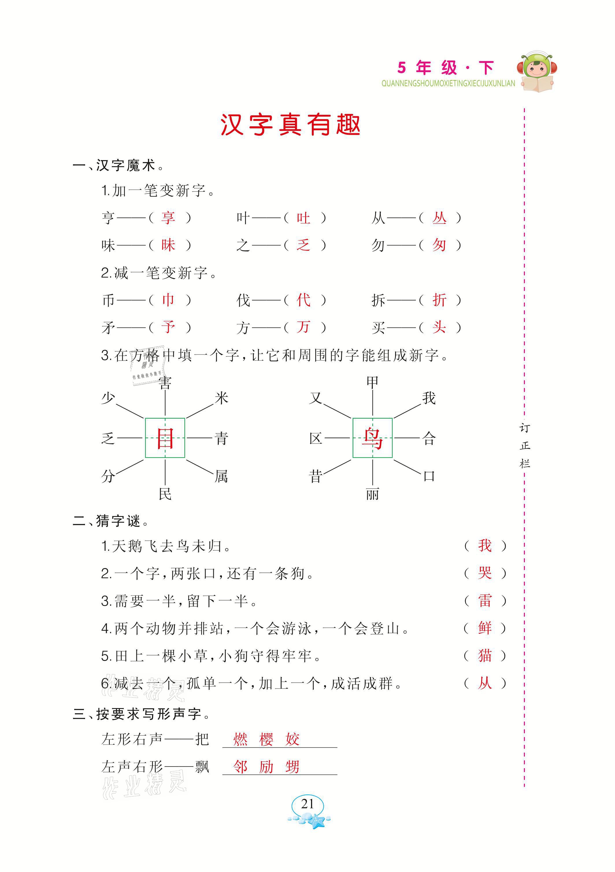 注:目前有些书本章节名称可能整理的还不是很完善,但都是按照顺序排列的,请同学们按照顺序仔细查找。练习册 2021年全能手默写听写词句训练五年级语文下册人教版 答案主要是用来给同学们做完题方便对答案用的,请勿直接抄袭。