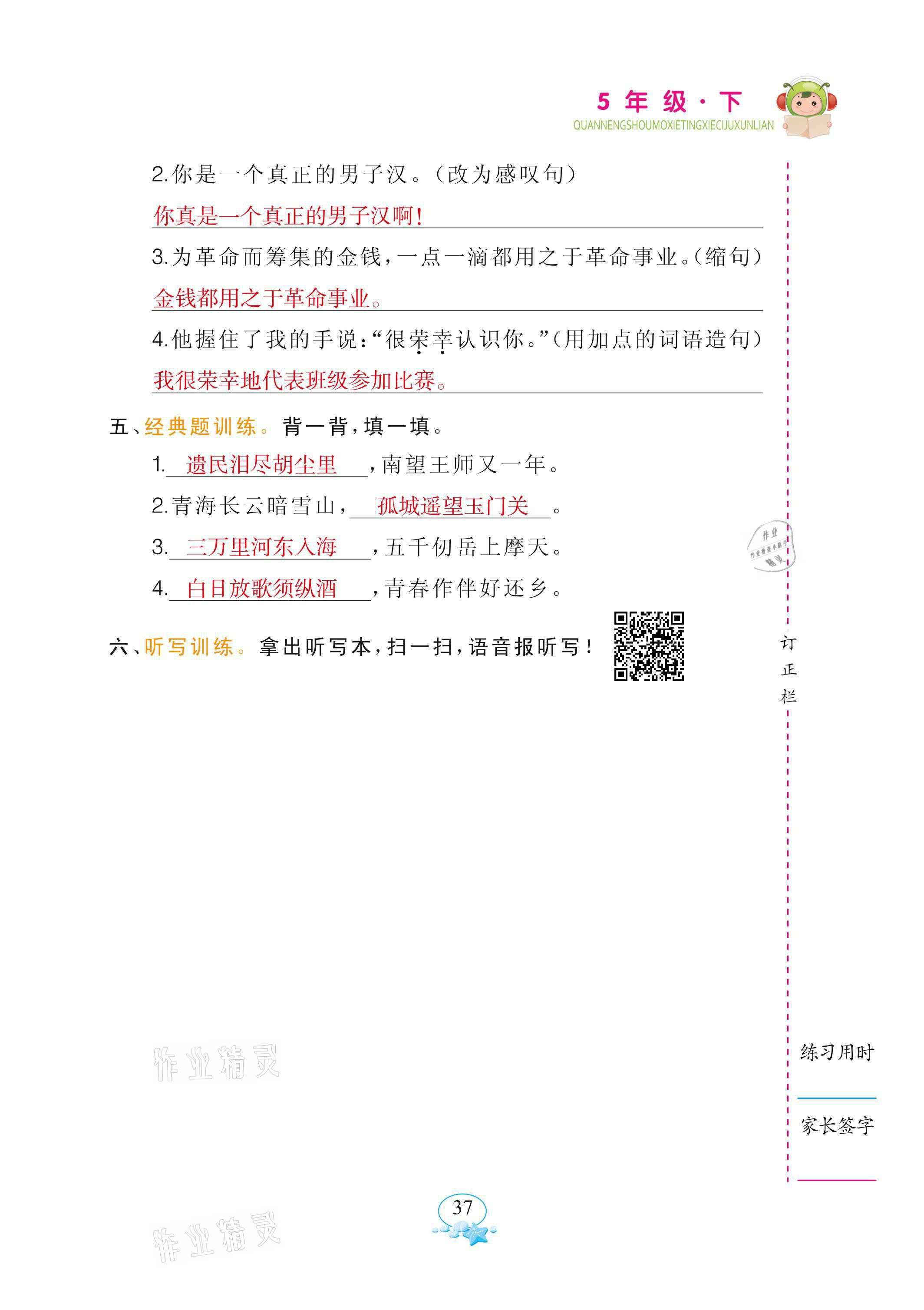 2021年全能手默写听写词句训练五年级语文下册人教版