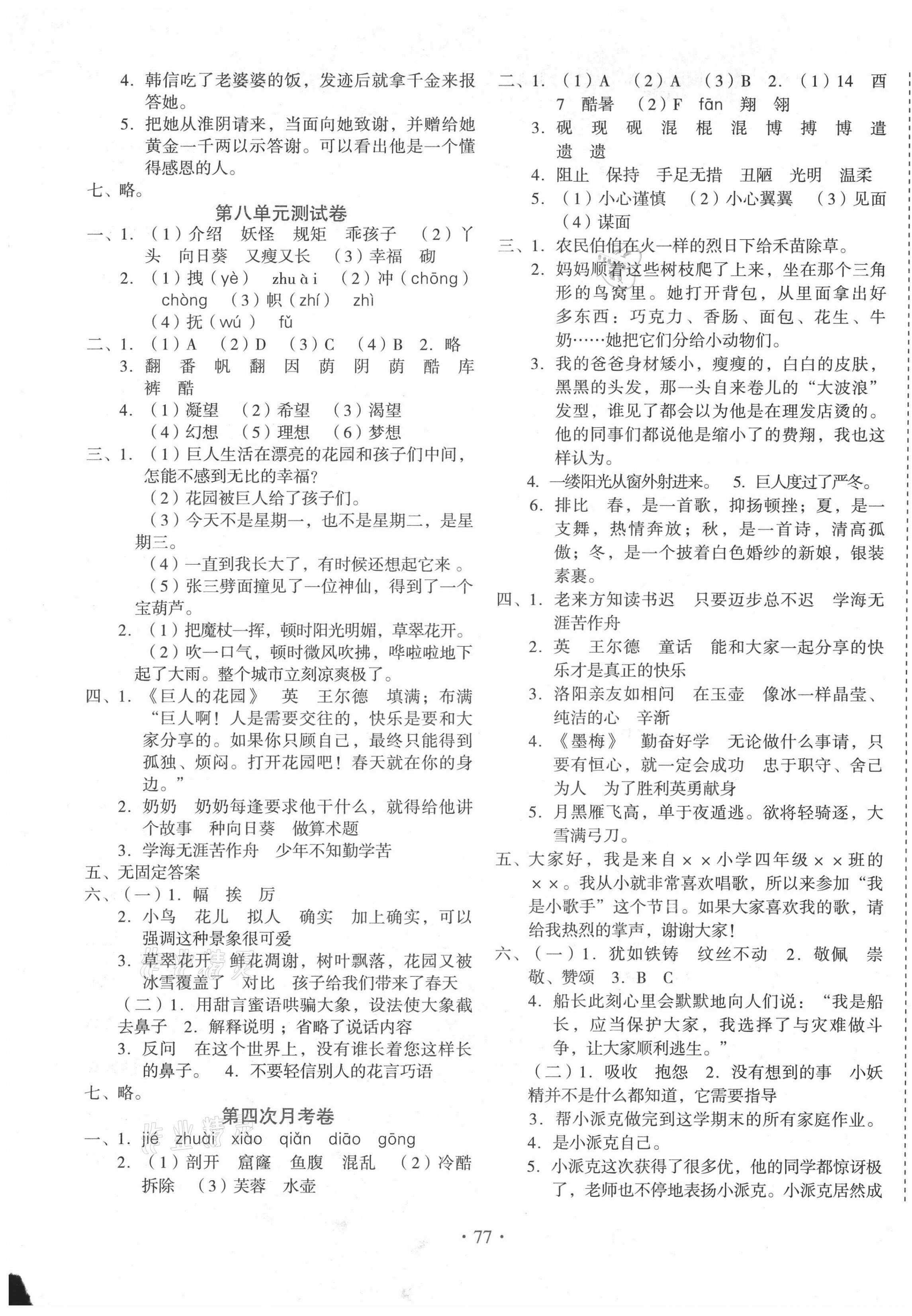注:目前有些书本章节名称可能整理的还不是很完善,但都是按照顺序排列的,请同学们按照顺序仔细查找。练习册 2021年启迪全优卷四年级语文下册人教版 答案主要是用来给同学们做完题方便对答案用的,请勿直接抄袭。