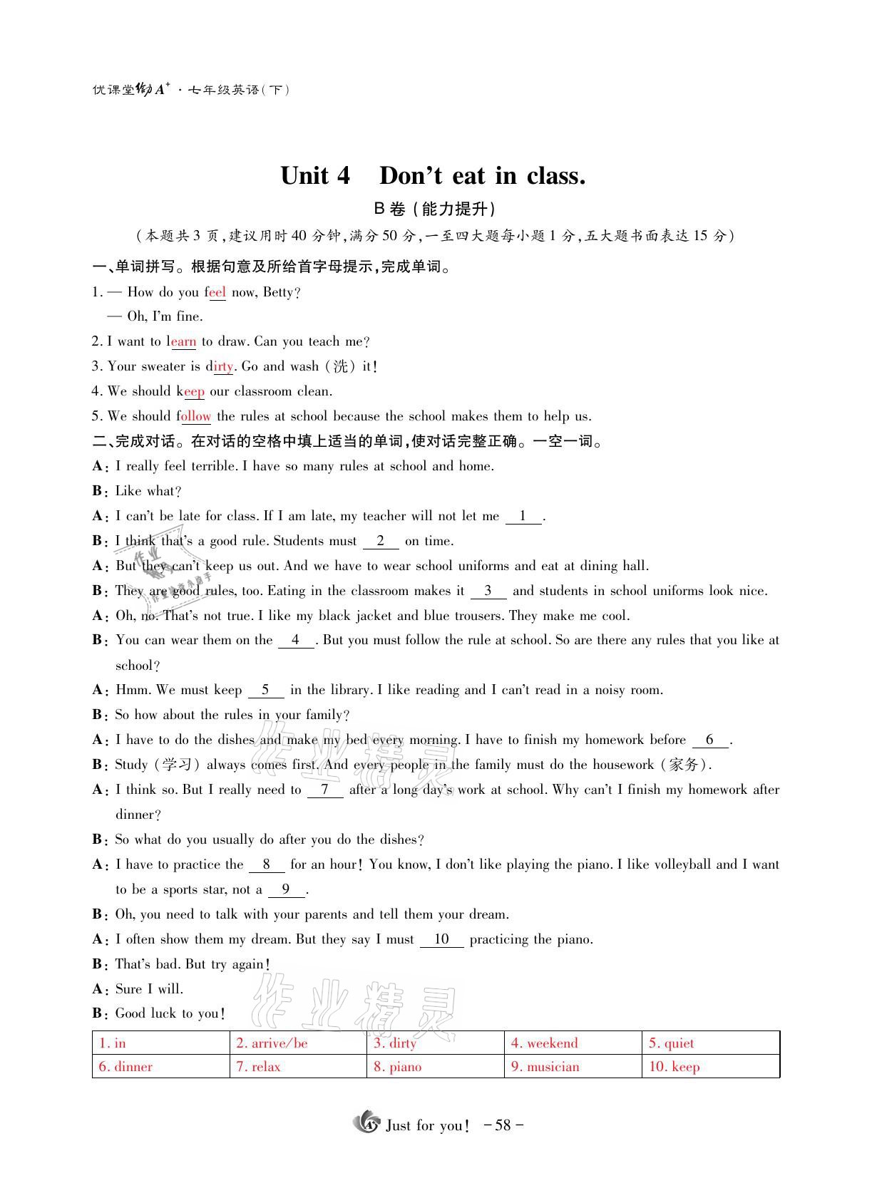 注:目前有些书本章节名称可能整理的还不是很完善,但都是按照顺序排列的,请同学们按照顺序仔细查找。练习册 2021年优课堂给力A加七年级英语下册人教版 答案主要是用来给同学们做完题方便对答案用的,请勿直接抄袭。