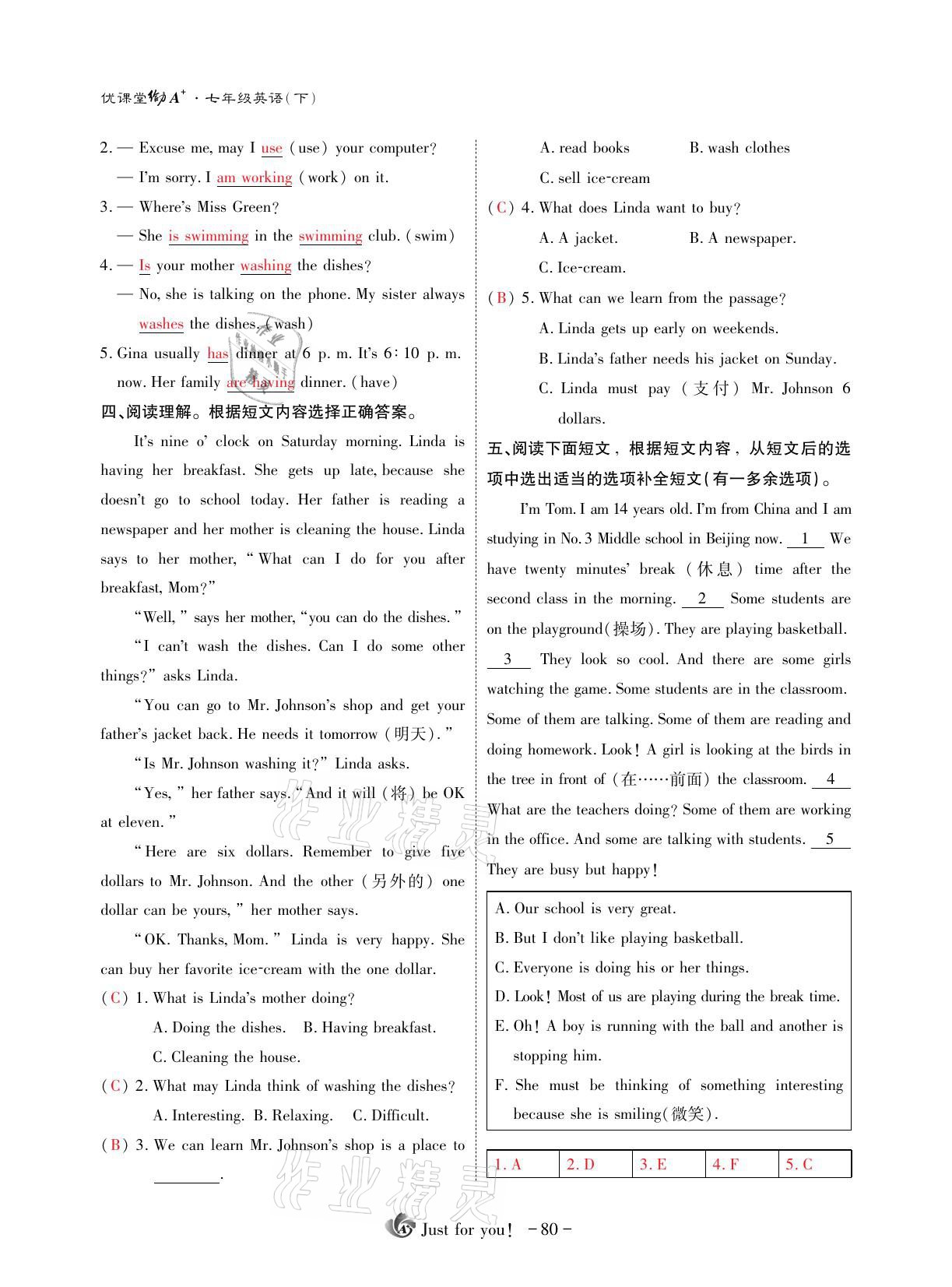 注:目前有些书本章节名称可能整理的还不是很完善,但都是按照顺序排列的,请同学们按照顺序仔细查找。练习册 2021年优课堂给力A加七年级英语下册人教版 答案主要是用来给同学们做完题方便对答案用的,请勿直接抄袭。