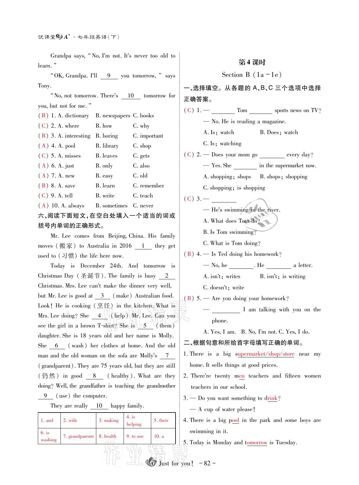 注:目前有些书本章节名称可能整理的还不是很完善,但都是按照顺序排列的,请同学们按照顺序仔细查找。练习册 2021年优课堂给力A加七年级英语下册人教版 答案主要是用来给同学们做完题方便对答案用的,请勿直接抄袭。