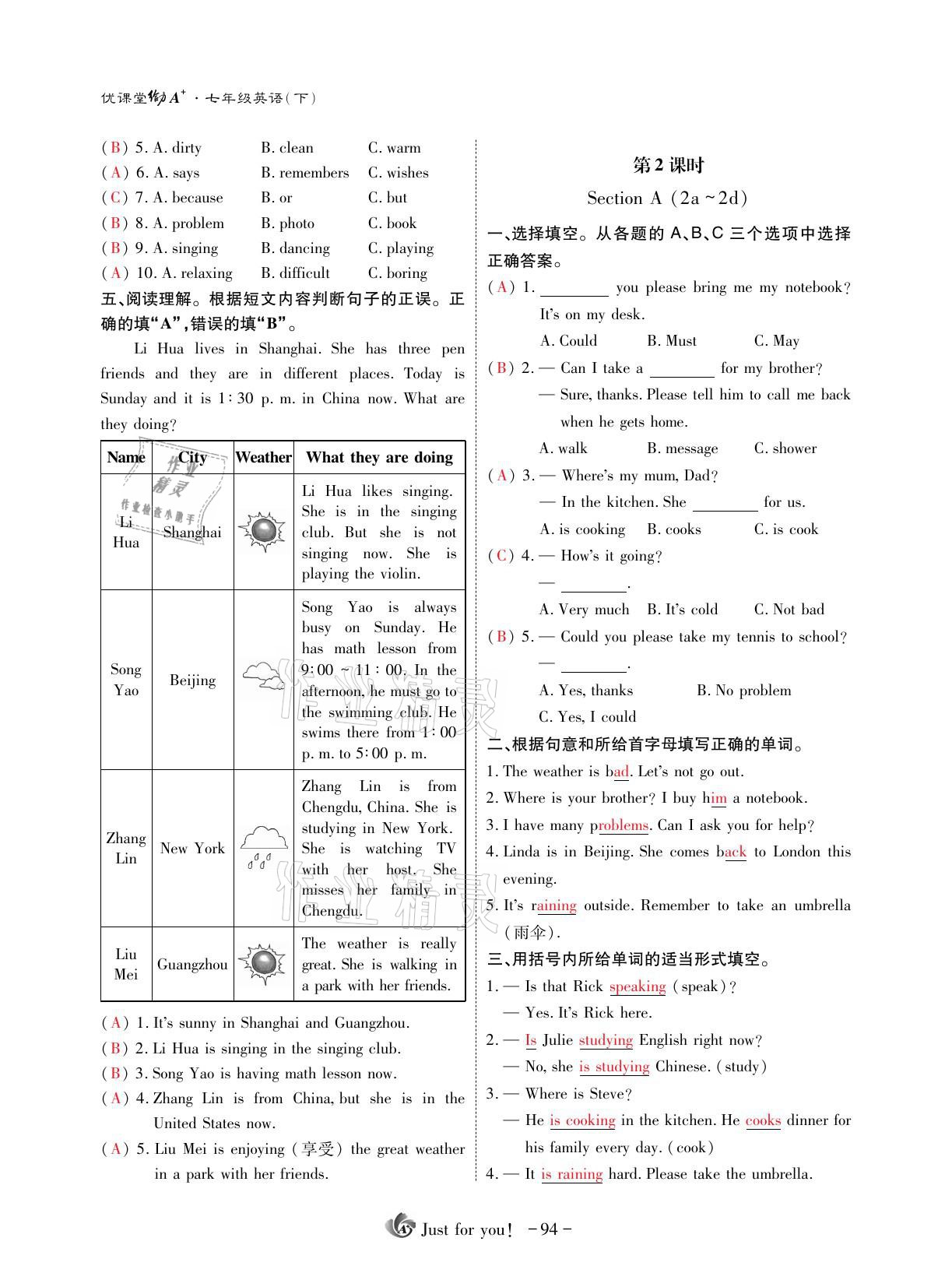 注:目前有些书本章节名称可能整理的还不是很完善,但都是按照顺序排列的,请同学们按照顺序仔细查找。练习册 2021年优课堂给力A加七年级英语下册人教版 答案主要是用来给同学们做完题方便对答案用的,请勿直接抄袭。