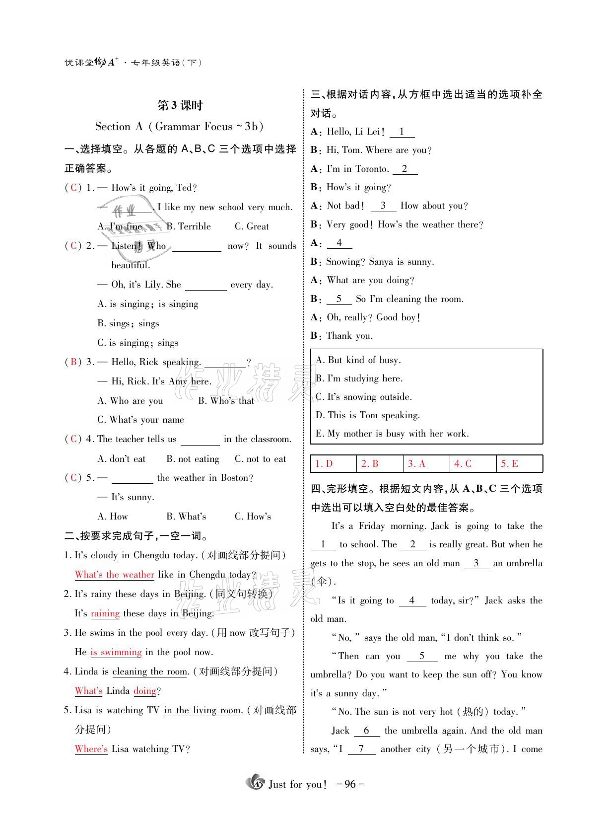 注:目前有些书本章节名称可能整理的还不是很完善,但都是按照顺序排列的,请同学们按照顺序仔细查找。练习册 2021年优课堂给力A加七年级英语下册人教版 答案主要是用来给同学们做完题方便对答案用的,请勿直接抄袭。