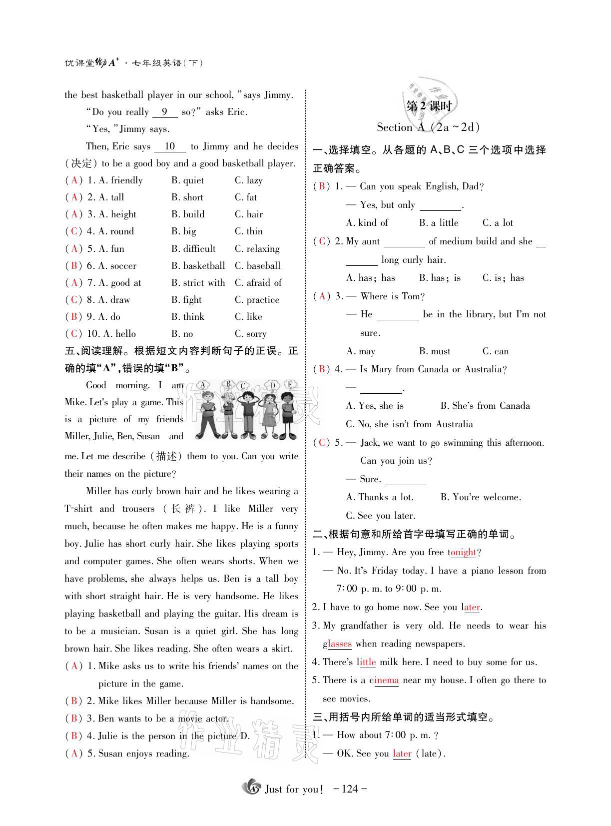 注:目前有些书本章节名称可能整理的还不是很完善,但都是按照顺序排列的,请同学们按照顺序仔细查找。练习册 2021年优课堂给力A加七年级英语下册人教版 答案主要是用来给同学们做完题方便对答案用的,请勿直接抄袭。