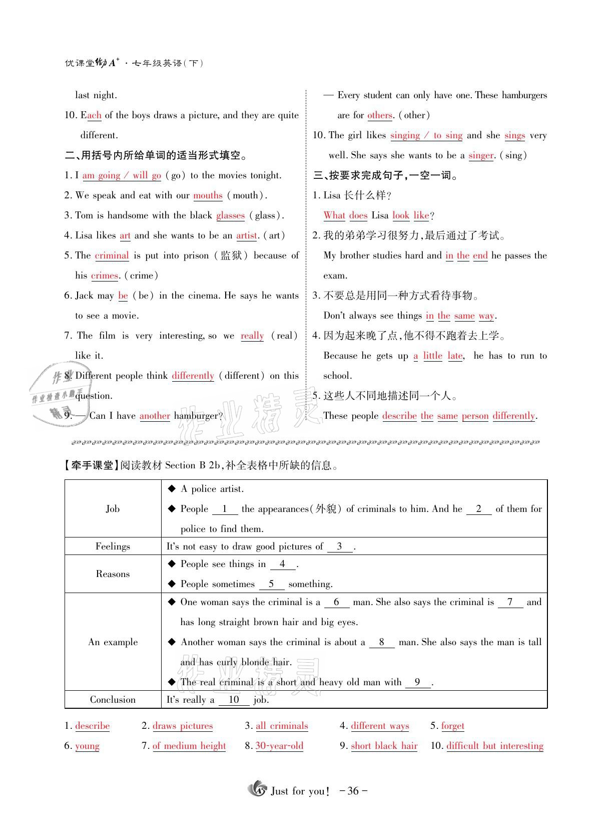 注:目前有些书本章节名称可能整理的还不是很完善,但都是按照顺序排列的,请同学们按照顺序仔细查找。练习册 2021年优课堂给力A加七年级英语下册人教版 答案主要是用来给同学们做完题方便对答案用的,请勿直接抄袭。