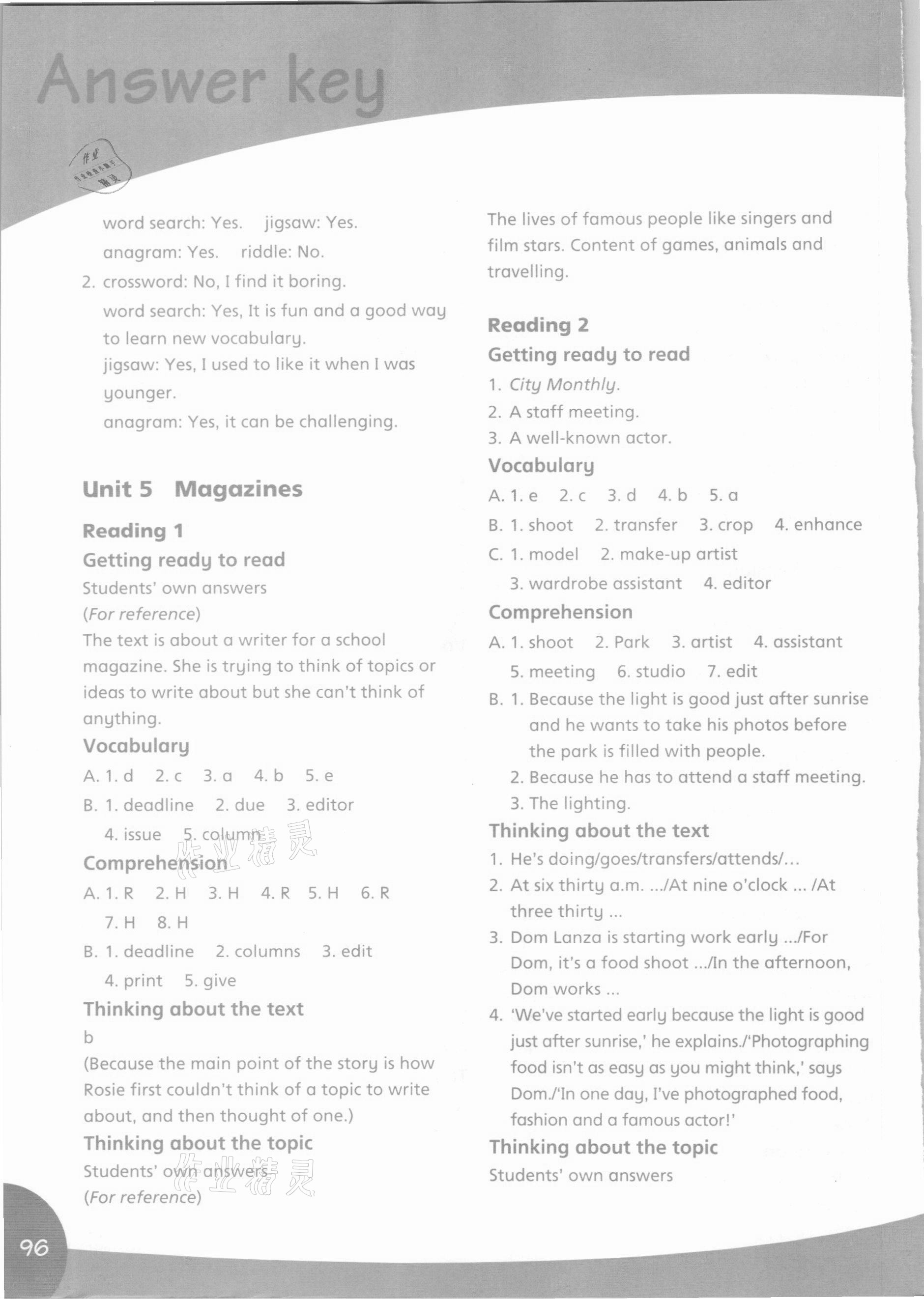注:目前有些书本章节名称可能整理的还不是很完善,但都是按照顺序排列的,请同学们按照顺序仔细查找。练习册 2021年初中英语阅读新思维八年级下册沪教版54制 答案主要是用来给同学们做完题方便对答案用的,请勿直接抄袭。