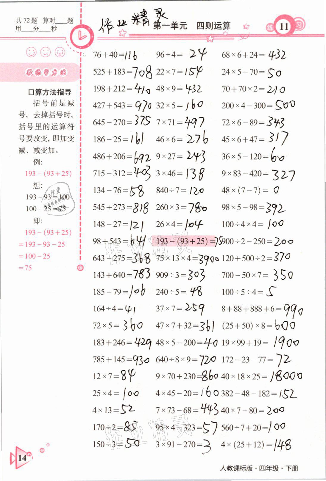 2021年整合集训口算速算天天练四年级数学下册人教版