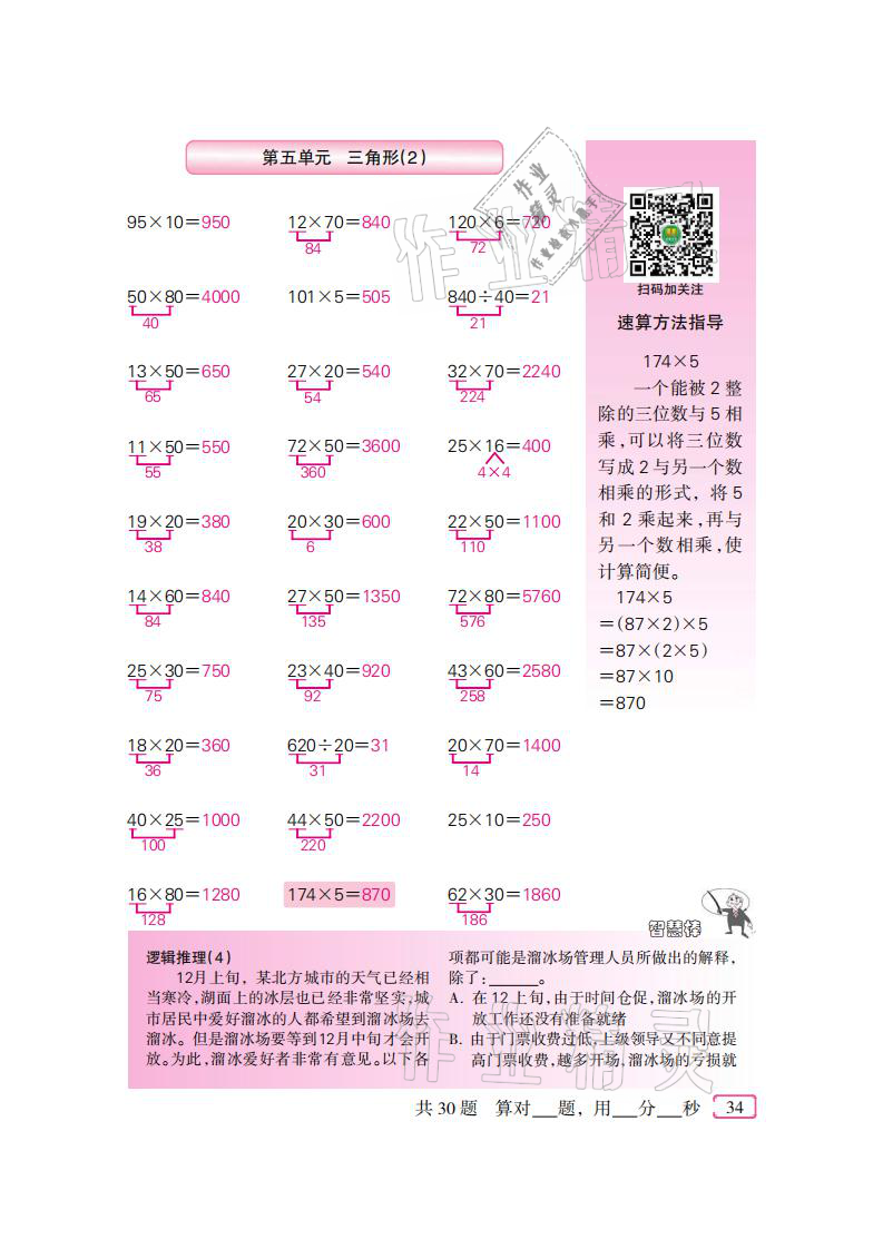 注:目前有些书本章节名称可能整理的还不是很完善,但都是按照顺序排列的,请同学们按照顺序仔细查找。练习册 2021年口算速算天天练四年级数学下册人教版新疆青少年出版社 答案主要是用来给同学们做完题方便对答案用的,请勿直接抄袭。