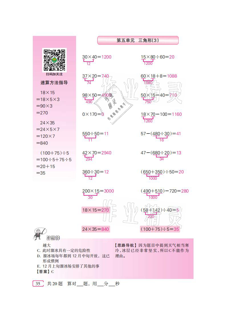 注:目前有些书本章节名称可能整理的还不是很完善,但都是按照顺序排列的,请同学们按照顺序仔细查找。练习册 2021年口算速算天天练四年级数学下册人教版新疆青少年出版社 答案主要是用来给同学们做完题方便对答案用的,请勿直接抄袭。