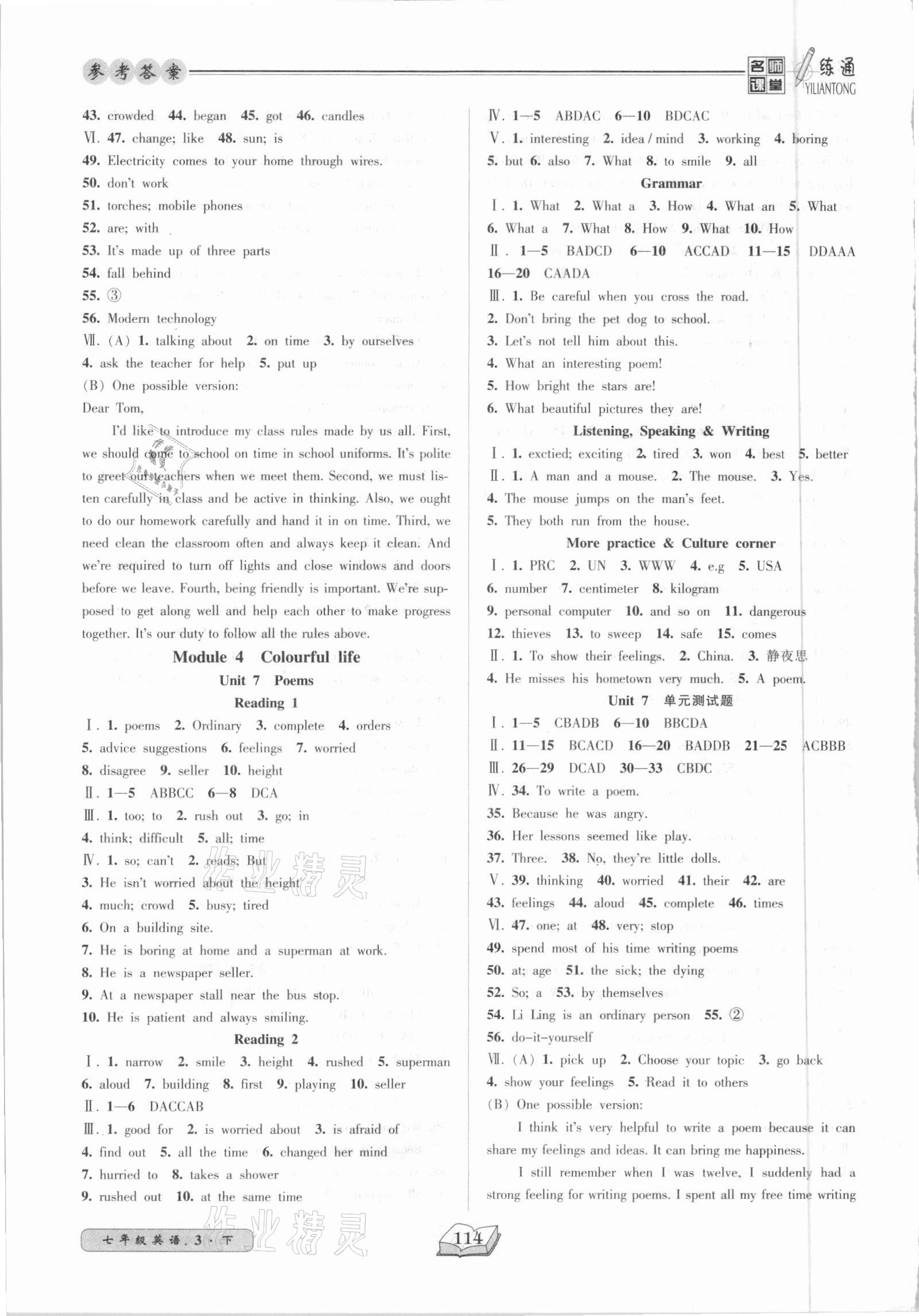 注:目前有些书本章节名称可能整理的还不是很完善,但都是按照顺序排列的,请同学们按照顺序仔细查找。练习册 2021年名师课堂一练通七年级英语下册牛津版 答案主要是用来给同学们做完题方便对答案用的,请勿直接抄袭。