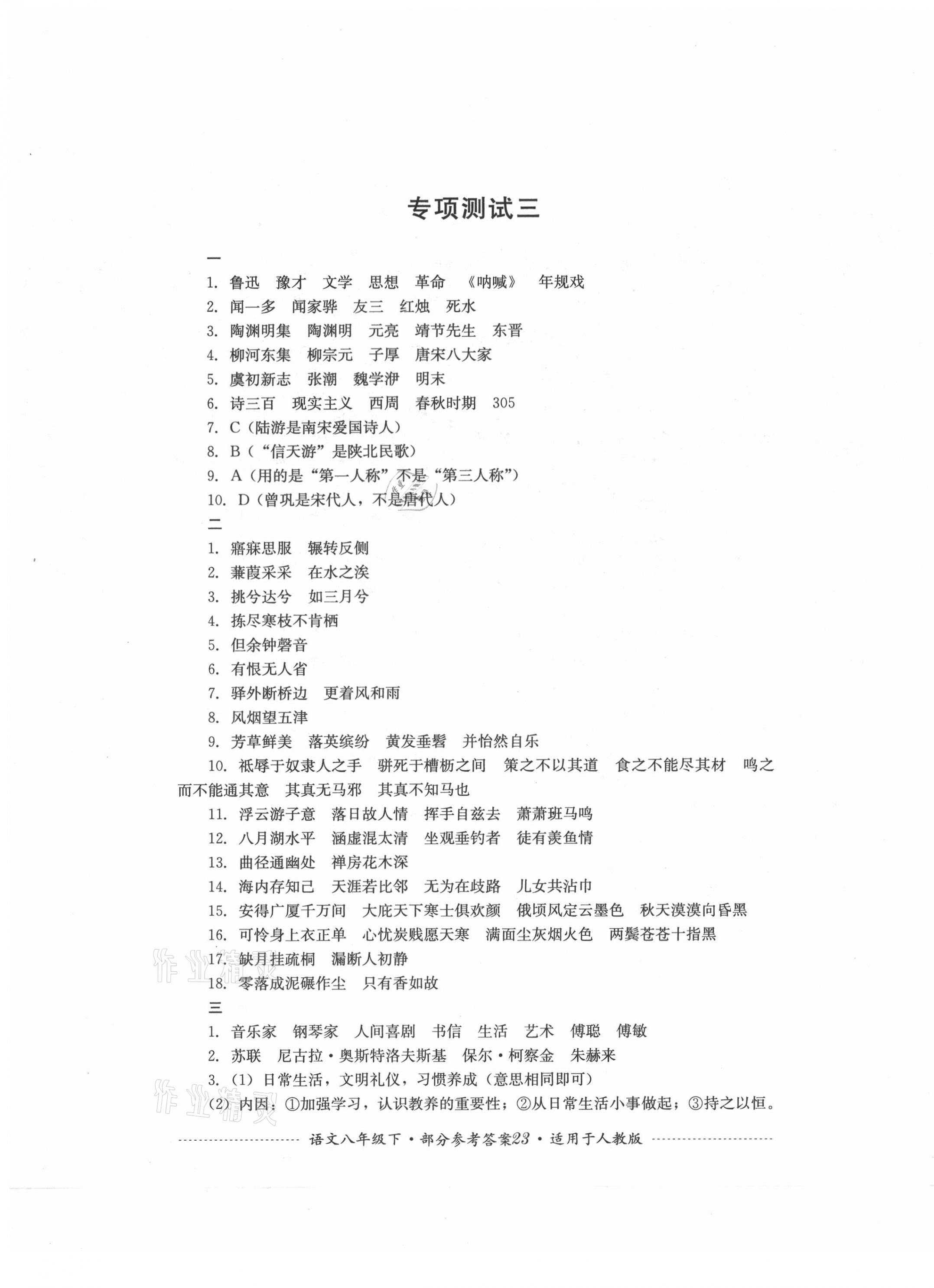 注:目前有些书本章节名称可能整理的还不是很完善,但都是按照顺序排列的,请同学们按照顺序仔细查找。练习册 2021年单元测试八年级语文下册人教版四川教育出版社 答案主要是用来给同学们做完题方便对答案用的,请勿直接抄袭。