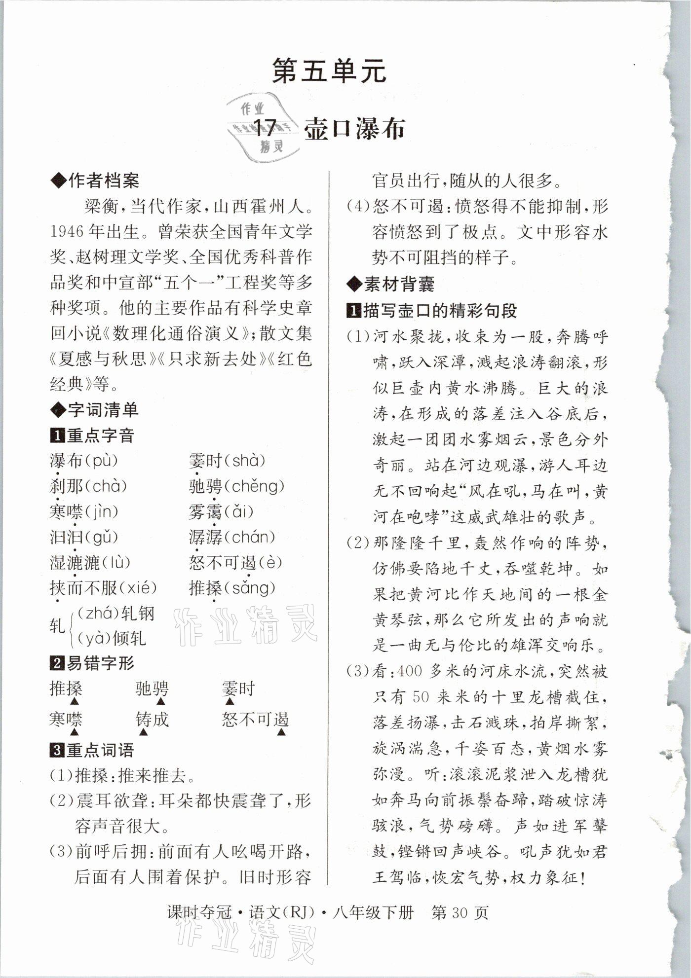 注:目前有些书本章节名称可能整理的还不是很完善,但都是按照顺序排列的,请同学们按照顺序仔细查找。练习册 2021年课时夺冠八年级语文下册人教版孝感专版 答案主要是用来给同学们做完题方便对答案用的,请勿直接抄袭。