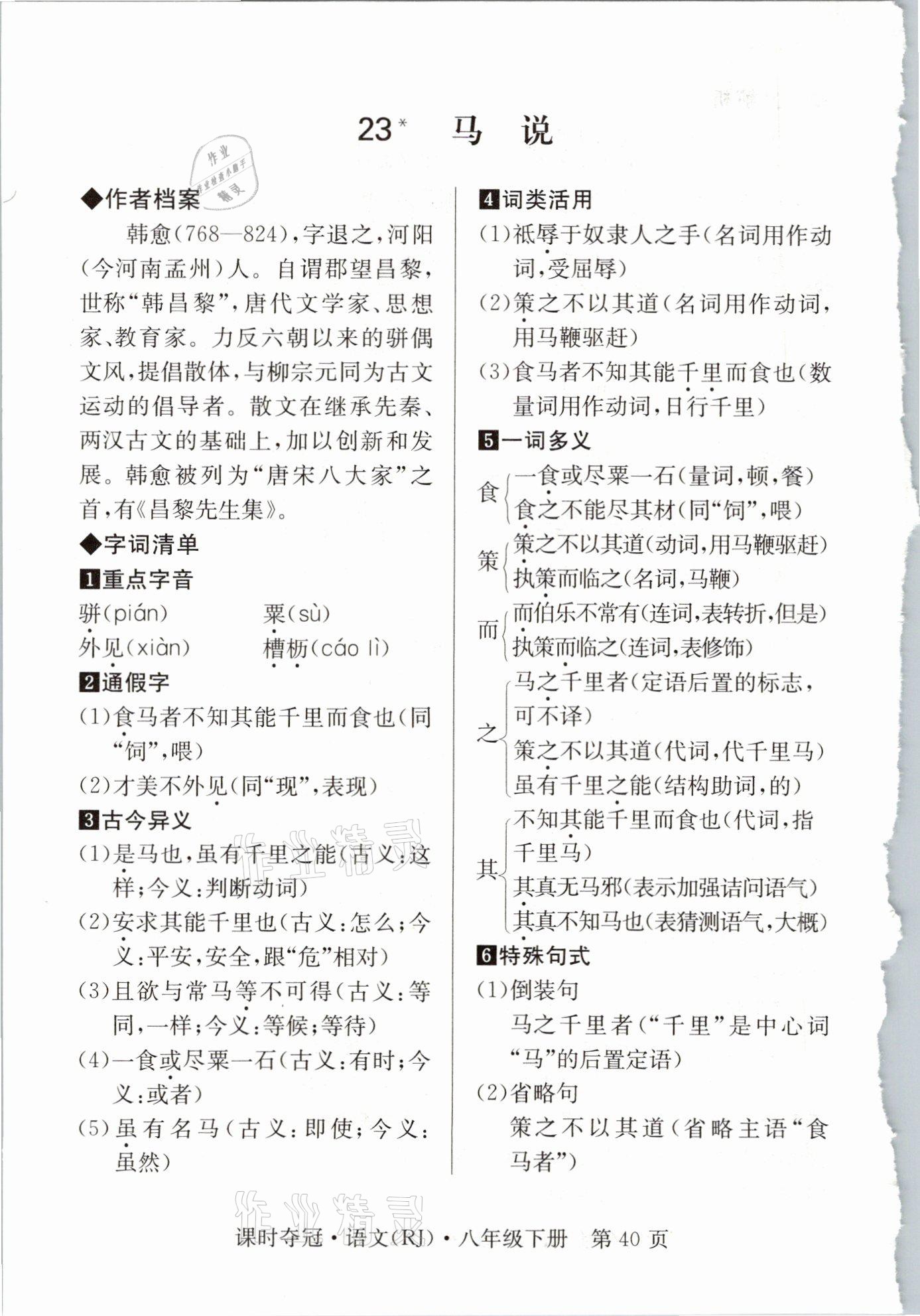 注:目前有些书本章节名称可能整理的还不是很完善,但都是按照顺序排列的,请同学们按照顺序仔细查找。练习册 2021年课时夺冠八年级语文下册人教版孝感专版 答案主要是用来给同学们做完题方便对答案用的,请勿直接抄袭。