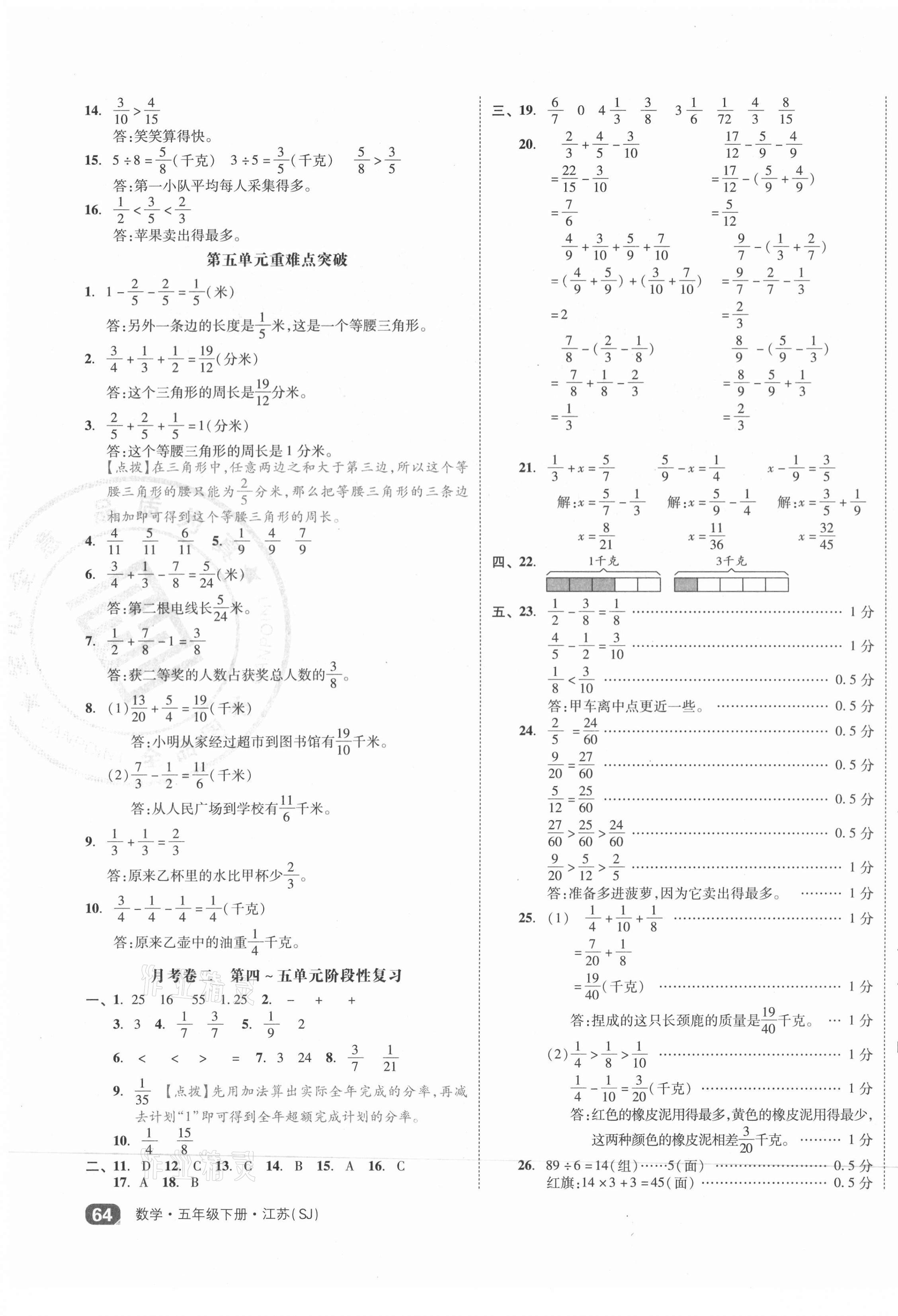 注:目前有些书本章节名称可能整理的还不是很完善,但都是按照顺序排列的,请同学们按照顺序仔细查找。练习册 2021年全品小复习五年级数学下册苏教版江苏专版 答案主要是用来给同学们做完题方便对答案用的,请勿直接抄袭。