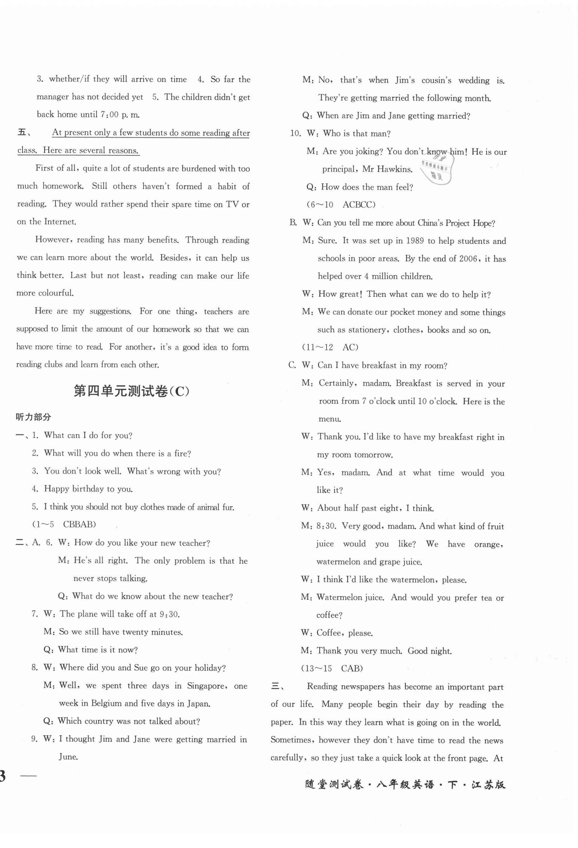 注:目前有些书本章节名称可能整理的还不是很完善,但都是按照顺序排列的,请同学们按照顺序仔细查找。练习册 2021年随堂测试卷八年级英语下册江苏版江苏凤凰美术出版社 答案主要是用来给同学们做完题方便对答案用的,请勿直接抄袭。
