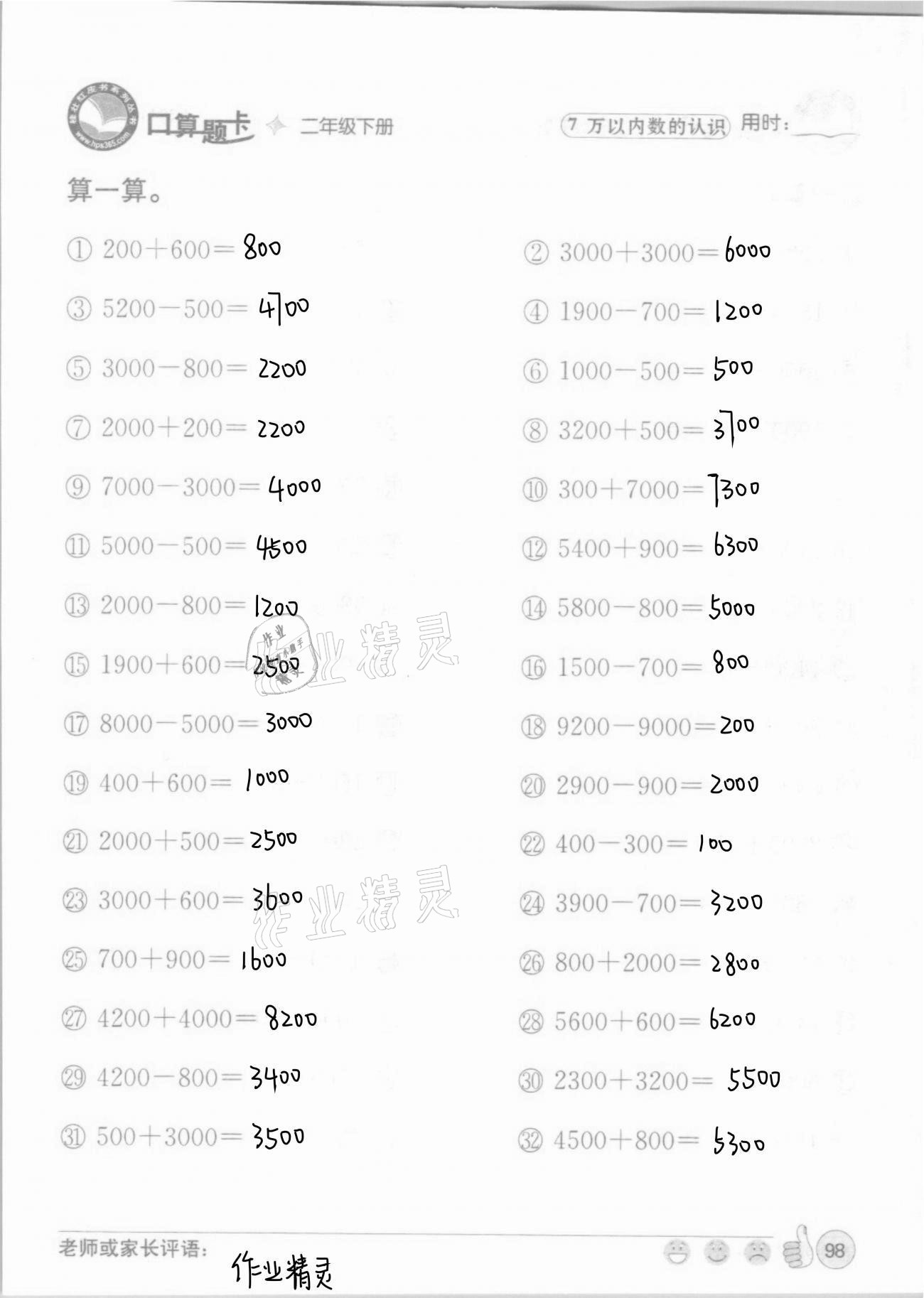2021年桂壮红皮书口算题卡二年级下册人教版