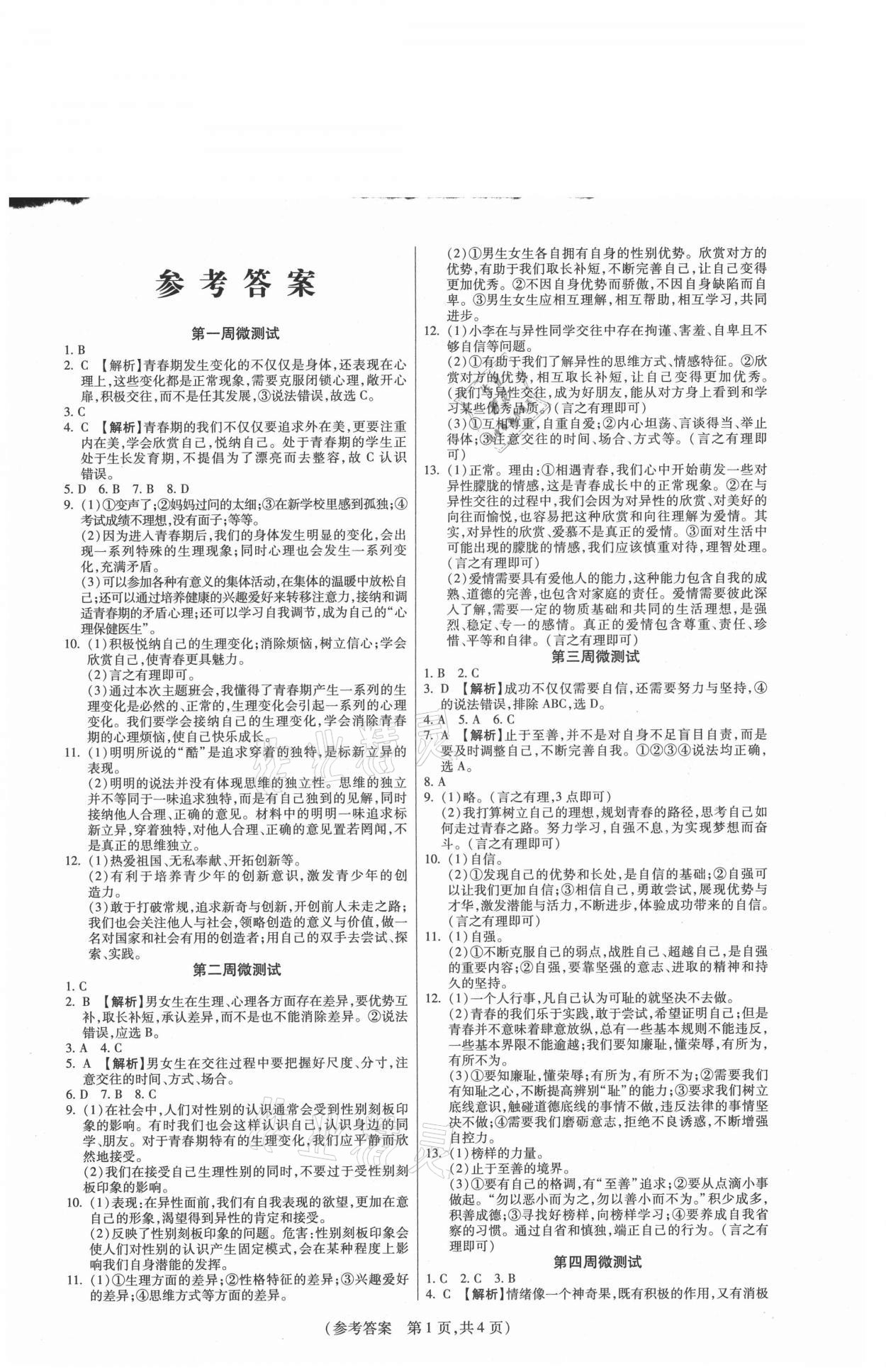 注:目前有些书本章节名称可能整理的还不是很完善,但都是按照顺序排列的,请同学们按照顺序仔细查找。练习册 2021年智能优选卷七年级道德与法治下册人教版 答案主要是用来给同学们做完题方便对答案用的,请勿直接抄袭。
