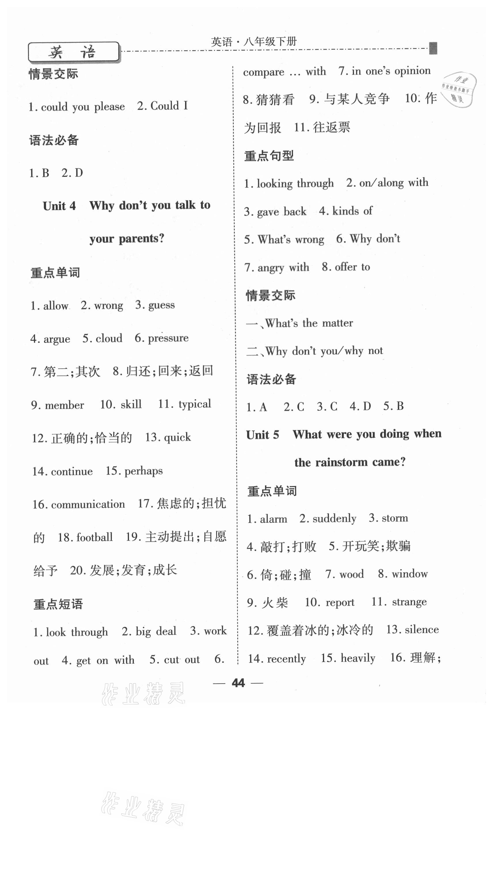 注:目前有些书本章节名称可能整理的还不是很完善,但都是按照顺序排列的,请同学们按照顺序仔细查找。练习册 2021年云南省考标准卷八年级英语下册人教版 答案主要是用来给同学们做完题方便对答案用的,请勿直接抄袭。