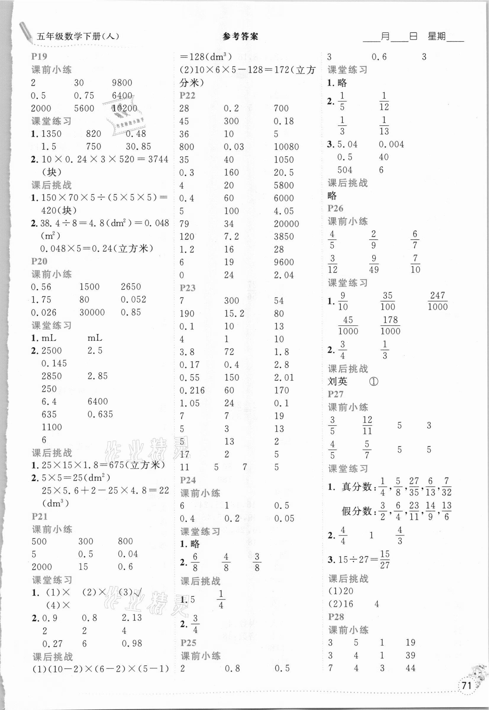 注:目前有些书本章节名称可能整理的还不是很完善,但都是按照顺序排列的,请同学们按照顺序仔细查找。练习册 2021年优秀生口算心法五年级下册人教版 答案主要是用来给同学们做完题方便对答案用的,请勿直接抄袭。