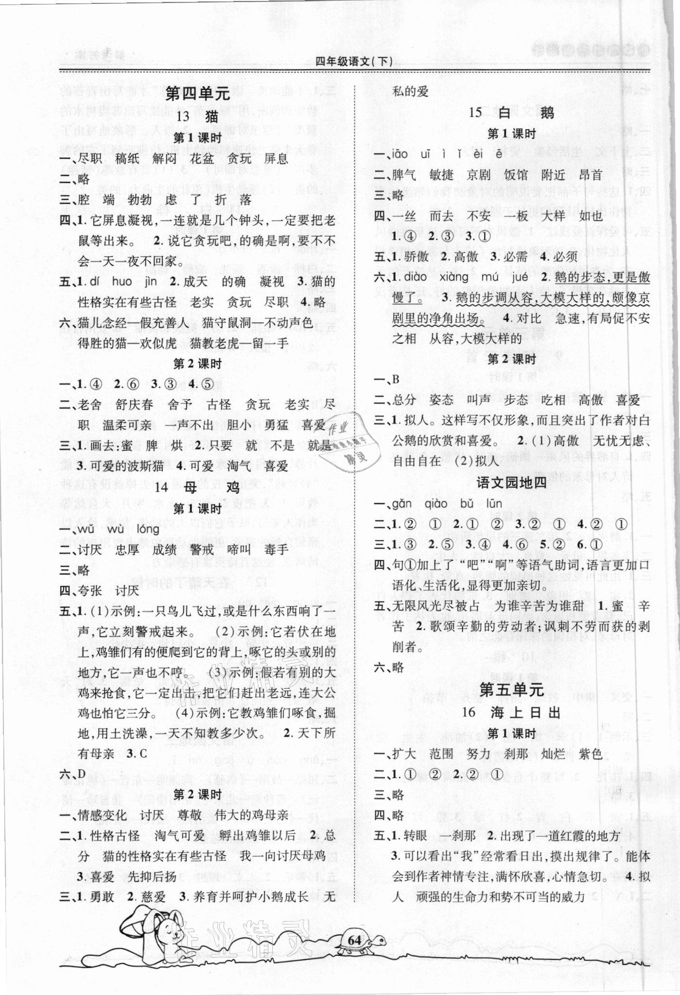 注:目前有些书本章节名称可能整理的还不是很完善,但都是按照顺序排列的,请同学们按照顺序仔细查找。练习册 2021年创新学习三级训练四年级语文下册通用版 答案主要是用来给同学们做完题方便对答案用的,请勿直接抄袭。