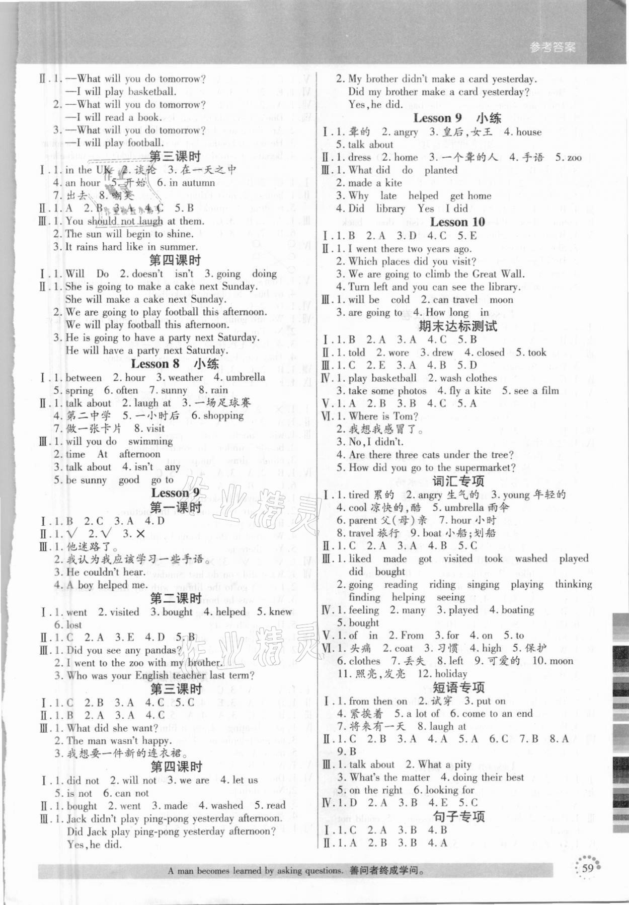 注:目前有些书本章节名称可能整理的还不是很完善,但都是按照顺序排列的,请同学们按照顺序仔细查找。练习册 2021年小状元随堂作业六年级英语下册科普版 答案主要是用来给同学们做完题方便对答案用的,请勿直接抄袭。
