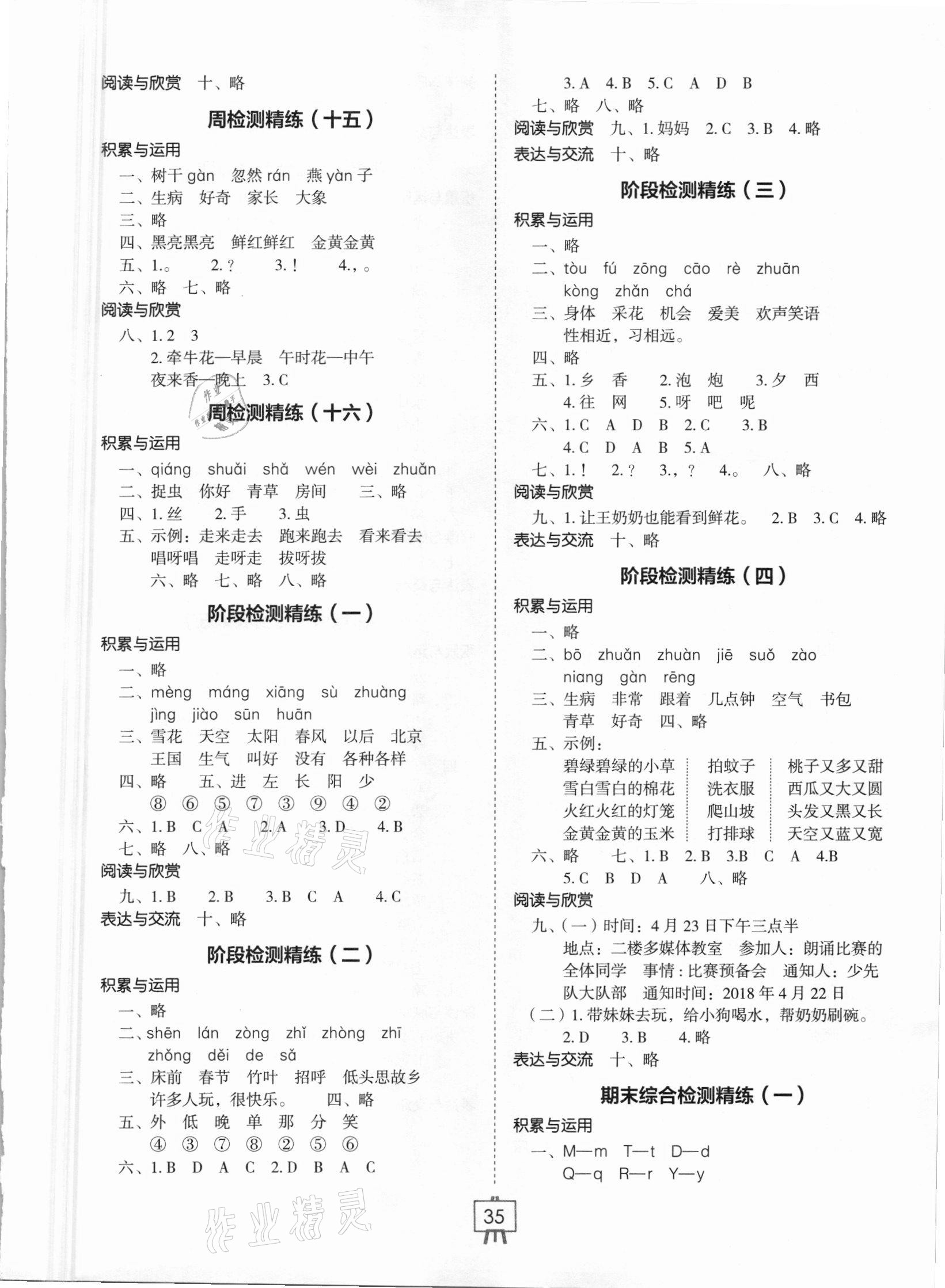 注:目前有些书本章节名称可能整理的还不是很完善,但都是按照顺序排列的,请同学们按照顺序仔细查找。练习册 2021年小学生检测精练一年级语文下册人教版 答案主要是用来给同学们做完题方便对答案用的,请勿直接抄袭。